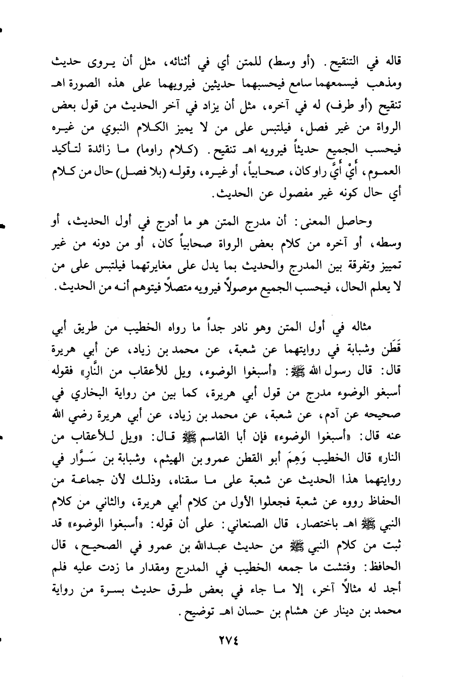 قاله في التنقيح. (أو وسط) للمتن أي في أثنائه، مثل أن يروى حديث ومذهب فيسمعهما سامع فيحسبهما حديثين فيرويهما على هذه الصورة اهـ تنقيح (أو طرف) له في آخره، مثل أن يزاد في آخر الحديث من قول بعض الرواة من غير فصل، فيلتبس على من لا يميز الكلام النبوي من غيره فيحسب الجميع حديثاً فيرويه. اهـ تنقيح. (كَلامُ رَاوٍ مَّا) ما زائدة لتأكيد العموم، أي أيَّ راو كان، صحابياً، أو غيره، وقوله (بلا فصل) حال من كلام أي حال كونه غير مفصول عن الحديث.