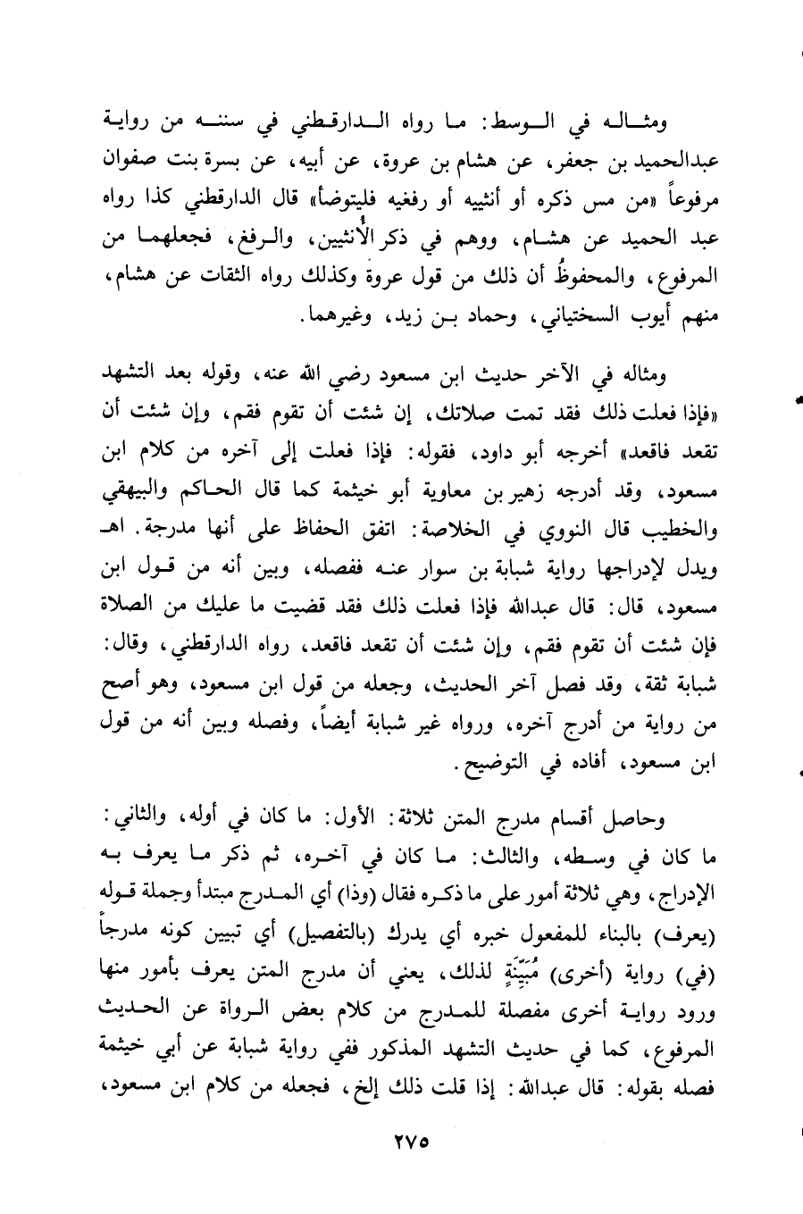 ومثاله في الآخر حديث ابن مسعود - رضي الله عنه -، وقوله بعد التشهد " فإذا فعلت ذلك فقد تمت صلاتك، إن شئت أن تقوم فقم، وإن شئت أن تقعد فاقعد " أخرجه أبو داود، فقوله: فإذا فعلت إلى آخره من كلام ابن مسعود، وقد أدرجه زهير بن معاوية أبو خيثمة كما قال الحاكم والبيهقي والخطيب قال النووي في الخلاصة: اتفق الحفاظ على أنها مدرجة. اهـ ويدل لإدراجها رواية شبابة بن سوار عنه ففصله، وبين أنه من قول ابن مسعود، قال: قال عبد الله فإذا فعلت ذلك فقد قضيت ما عليك من الصلاة فإن شئت أن تقوم فقم، وإن شئت أن تقعد فاقعد، رواه الدارقطني، وقال: شبابة ثقة، وقد فصل آخر الحديث، وجعله من قول ابن مسعود، وهو أصح من رواية من أدرج آخره، ورواه غير شبابة أيضاً، وفصله وبين أنه من قول ابن مسعود، أفاده في التوضيح.