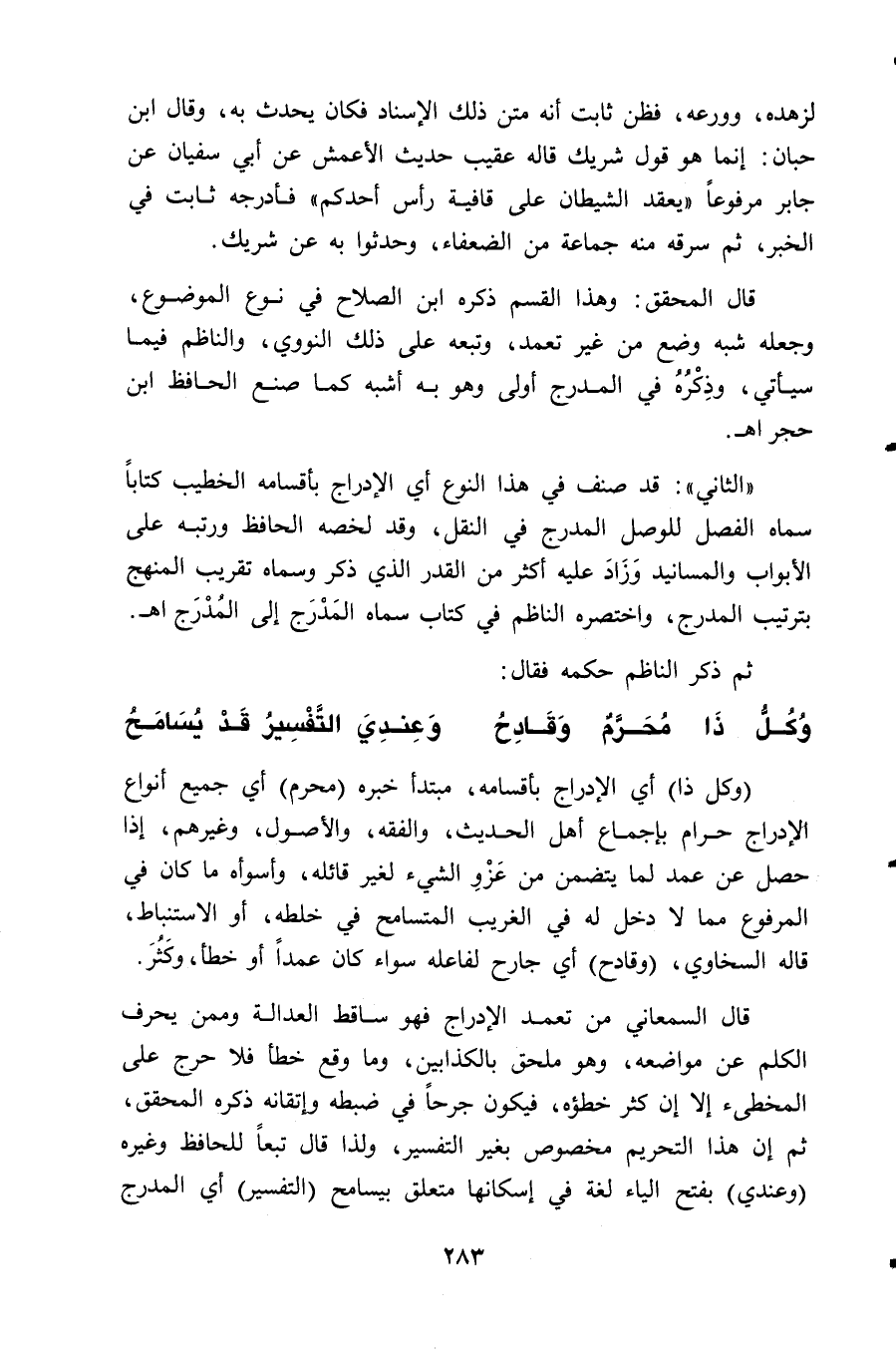 " الثاني ": قد صنف في هذا النوع أي الإدراج بأقسامه الخطيب كتاباً سماه " الفصل للوصل المدرج في النقل "، وقد لخصه الحافظ ورتبه على الأبواب والمسانيد وَزَادَ عليه أكثر من القدر الذي ذكر وسماه تقريب المنهج بترتيب المدرج، واختصره الناظم في كتاب سماه المَدْرَج إلى المُدْرَج اهـ.