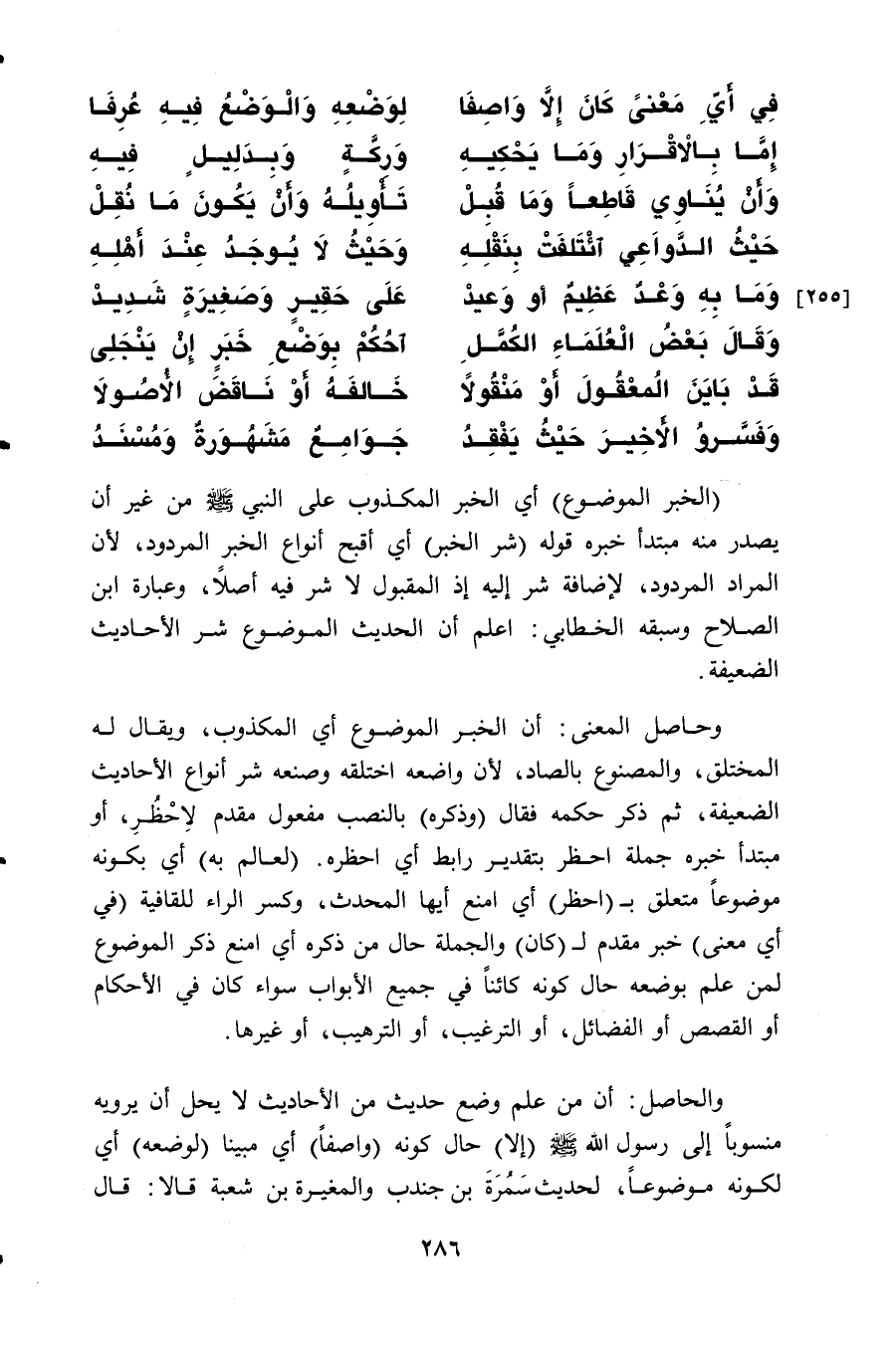 وحاصل المعنى: أن الخبر الموضوع أي المكذوب، ويقال له المختلق، والمصنوع بالصاد، لأن واضعه اختلقه وصنعه شر أنواع الأحاديث الضَّعِيفة، ثم ذكر حكمه فقال (وذكره) بالنصب مفعول مقدم لاِحْظُرِ، أو مبتدأ خبره جملة احظر بتقدير رابط أي احظره. (لعالم به) أي بكونه موضوعاً متعلق بـ (احظر) أي امنع أيها المحدث، وكسر الراء للقافية (في أي معنى) خبر مقدم لـ (كان) والجملة حال من ذكره أي امنع ذكر الموضوع لمن علم بوضعه حال كونه كائناً في جميع الأبواب سواء كان في الأحكام أو القصص أو الفضائل، أو الترغيب، أو الترهيب، أو غيرها.