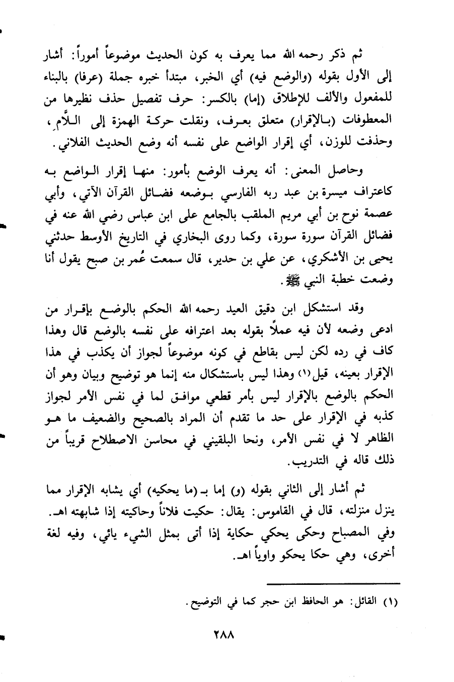 وحاصل المعنى: أنه يعرف الوضع بأمور: منها إقرار الواضع به كاعتراف ميسرة بن عبد ربه الفارسي بوضعه فضائل القرآن الآتي، وأبي عصمة نوح بن أبي مريم الملقب بالجامع على ابن عباس - رضي الله عنه - في فضائل القرآن سورة سورة، وكما روى البخاري في التاريخ الأوسط حدثني يَحْيَى بن الأشكري، عن علي بن حدير، قال سمعت عُمر بن صبح يقول أنا وضعت خطبة النبي - صلى الله عليه وسلم -.