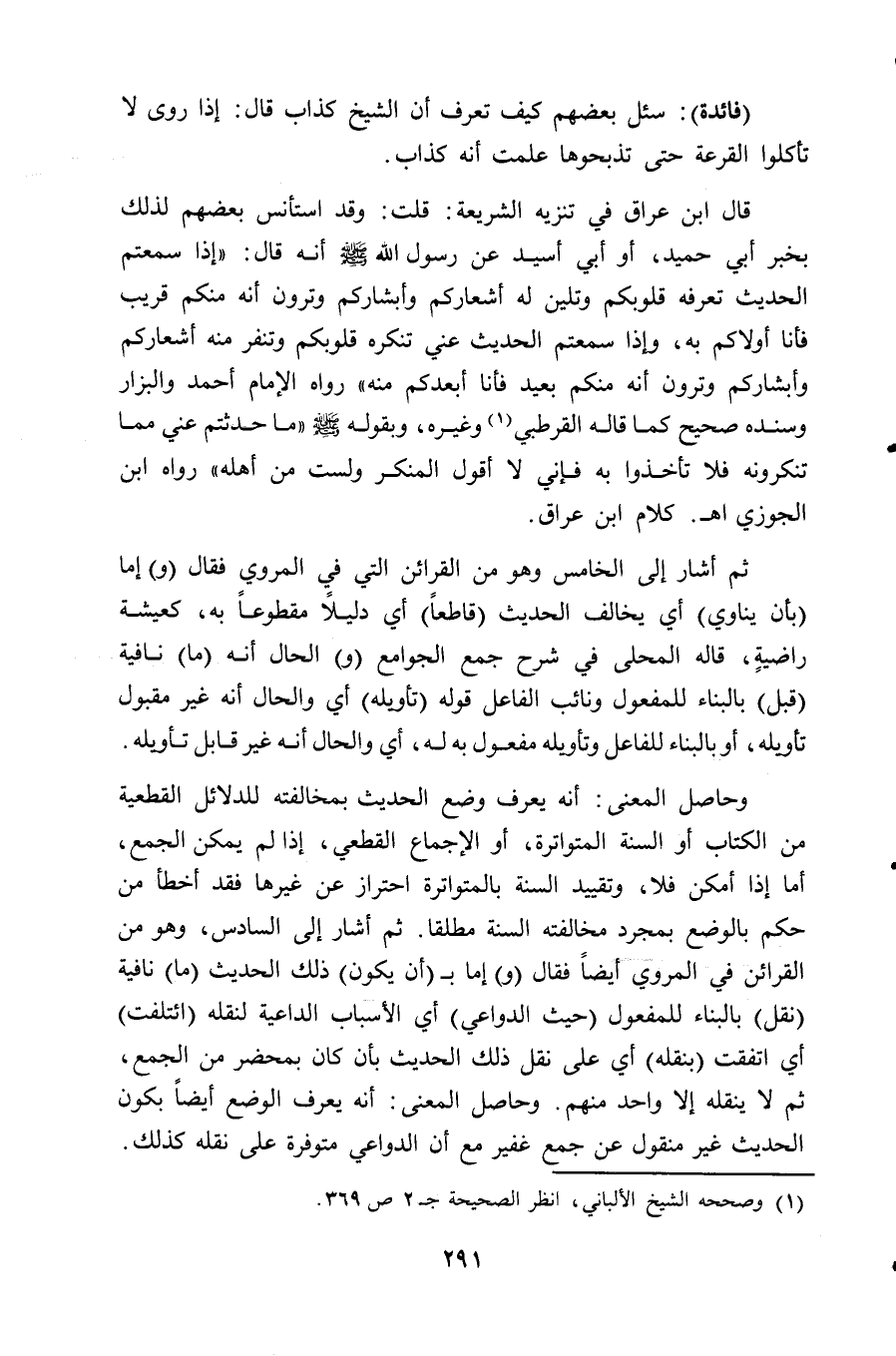 قال ابن عراق في تنزيه الشريعة: قلت: وقد استأنس بعضهم لذلك بخبر أبي حميد، أو أبي أسيد عن رسول الله - صلى الله عليه وسلم - أنه قال: " إذا سمعتم الحديث تعرفه قلوبكم وتلين له أشعاركم وأبشاركم وترون أنه منكم قريب فأنا أولاكم به، وإذا سمعتم الحديث عني تنكره قلوبكم وتنفر منه أشعاركم وأبشاركم وترون أنه منكم بعيد فأنا أبعدكم منه " رواه الإمام أحمد والبزار وسنده صحيح كما قاله القرطبي (¬1) وغيره، وبقوله - صلى الله عليه وسلم - " ما حدثتم عني مما تنكرونه فلا تأخذوا به فإني لا أقول المنكر ولست من أهله " رواه ابن الجوزي. اهـ. كلام ابن عراق.
