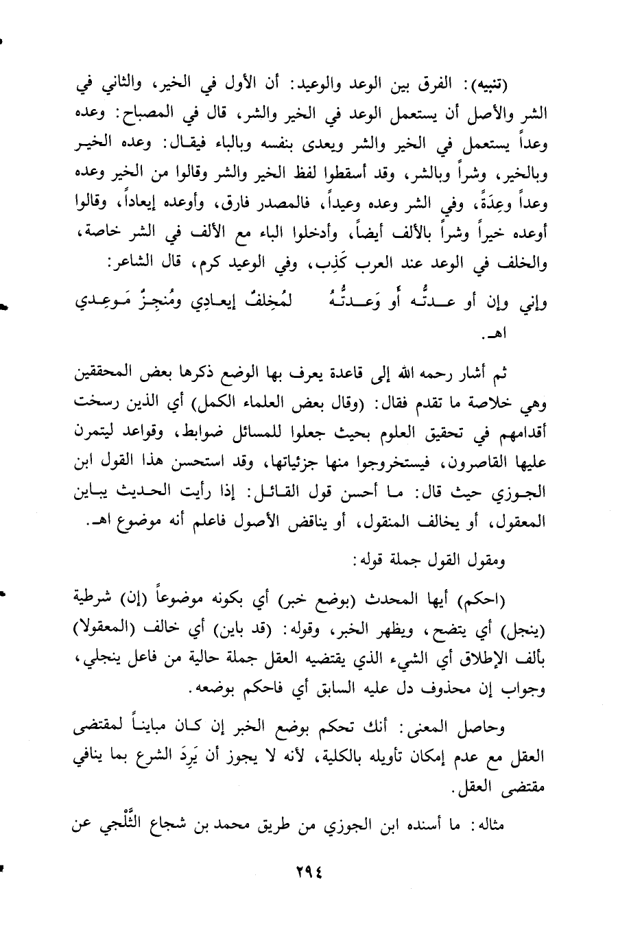 (تنبيه): الفرق بين الوعد والوعيد: أن الأول في الخير، والثاني في الشر والأصل أن يستعمل الوعد في الخير والشر، قال في المصباح: وعده وعداً يستعمل في الخير والشر ويعدى بنفسه وبالباء فيقال: وعده الخير وبالخير، وشراً وبالشر، وقد أسقطوا لفظ الخير والشر وقالوا من الخير وعده وعداً وعِدَةً، وفي الشر وعده وعيداً، فالمصدر فارق، وأوعده إيعاداً، وقالوا أوعده خيراً وشراً بالألف أيضاً، وأدخلوا الباء مع الألف في الشر خاصة، والخلف في الوعد عند العرب كَذِب، وفي الوعيد كرم، قال الشاعر: