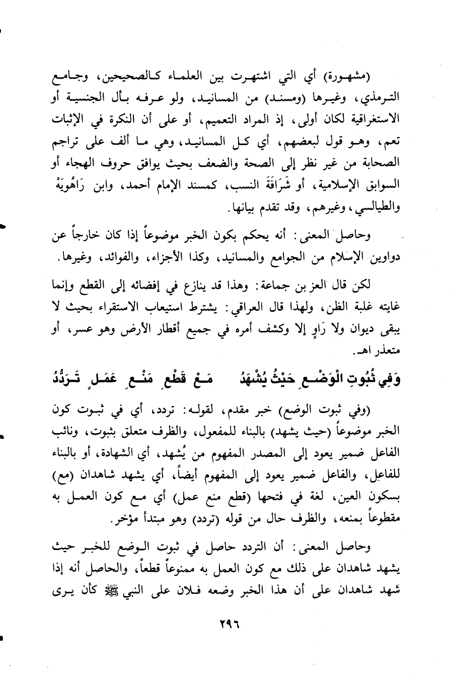 (وفي ثبوت الوضع) خبر مقدم، لقوله: تردد، أي في ثبوت كون الخبر موضوعاً (حيث يشهد) بالبناء للمفعول، والظرف متعلق بثبوت، ونائب الفاعل ضمير يعود إلى المصدر المفهوم من يُشهد، أي الشهادة، أو بالبناء للفاعل، والفاعل ضمير يعود إلى المفهوم أيضاً، أي يشهد شاهدان (مع) بسكون العين، لغة في فتحها (قطع منع عمل) أي مع كون العمل به مقطوعاً بمنعه، والظرف حال من قوله (تردد) وهو مبتدأ مؤخر.