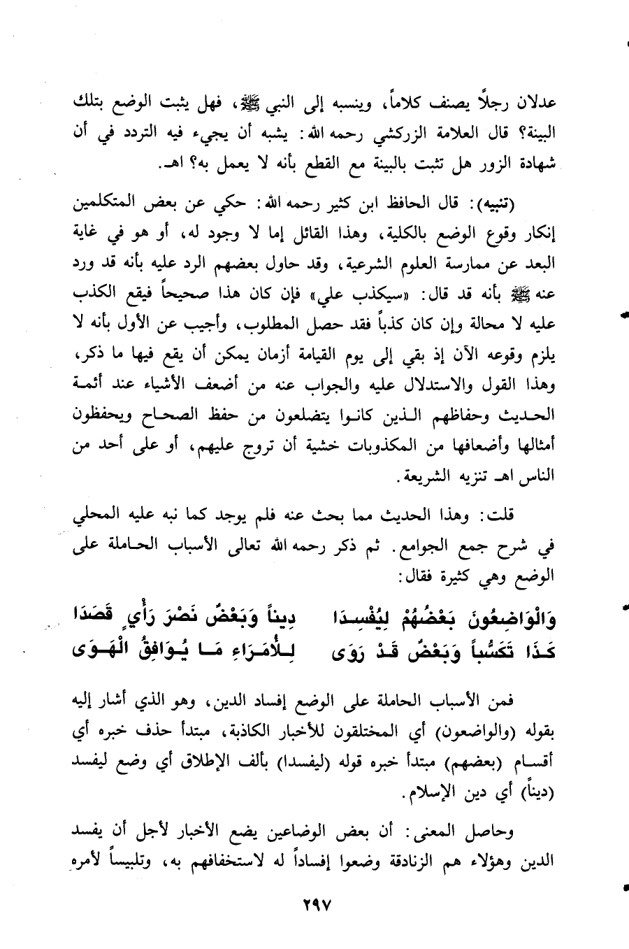 (تنبيه): قال الحافظ ابن كثير رحمه الله: حكي عن بعض المتكلمين إنكار وقوع الوضع بالكلية، وهذا القائل إما لا وجود له، أو هو في غاية البعد عن ممارسة العلوم الشرعية، وقد حاول بعضهم الرد عليه بأنه قد ورد عنه - صلى الله عليه وسلم - بأنه قد قال: " سيكذب عليَّ " فإن كان هذا صحيحاً فيقع الكذب عليه لا محالة وإن كان كذباً فقد حصل المطلوب، وأجيب عن الأول بأنه لا يلزم وقوعه الآن إذ بقي إلى يوم القيامة أزمان يمكن أن يقع فيها ما ذكر، وهذا القول والاستدلال عليه والجواب عنه من أضعف الأشياء عند أئمة الحديث وحفاظهم الذين كانوا يتضلعون من حفظ الصحاح ويحفظون أمثالها وأضعافها من المكذوبات خشية أن تروج عليهم، أو على أحد من الناس. اهـ تنزيه الشريعة.
