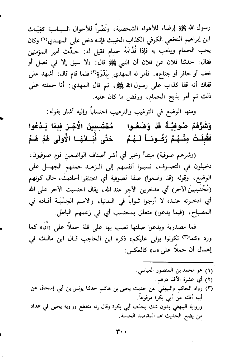 رسول الله - صلى الله عليه وسلم - إرضاء للأهواء الشخصية، ونَصْراً للأحوال السياسية كغِيَاث ابن إبراهيم النخعي الكوفي الكذاب الخبيث فإنه دخل على المهدي (¬1) وكان يحب الحمام ويلعب به فإذا قُدَّامَهُ حمام فقيل له: حدِّث أمير المؤمنين فقال: حدثنا فلان عن فلان أن النبي - صلى الله عليه وسلم - قال: " لا سبق إلا في نصل أو خف أو حافر أو جناح ". فأمر له المهديِ بِبَدْرَةٍ (¬2) فلما قام قال: أشهد على قفاك أنه قفا كذاب على رسول الله - صلى الله عليه وسلم -، ثم قال المهدي: أنا حملته على ذلك ثم أمر بذبح الحمام، ورفض ما كان عليه.