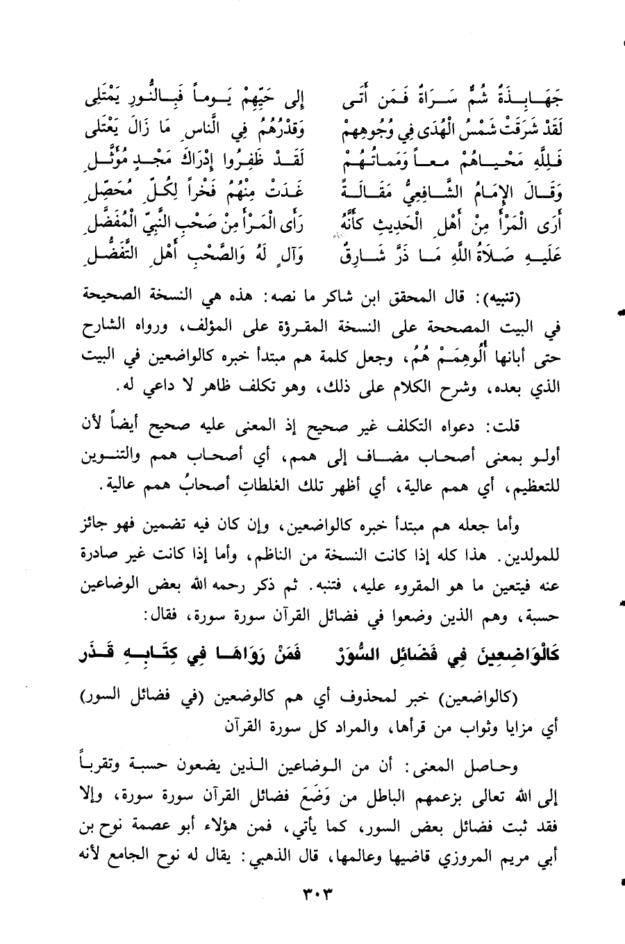 وأما جعله هم مبتدأ خبره كالواضعين، وإن كان فيه تضمين فهو جائز للمولدين. هذا كله إذا كانت النسخة من الناظم، وأما إذا كانت غير صادرة عنه فيتعين ما هو المقروء عليه، فتنبه. ثم ذكر رحمه الله بعض الوضاعين حسبة، وهم الذين وضعوا في فضائل القرآن سورة سورة، فقال: