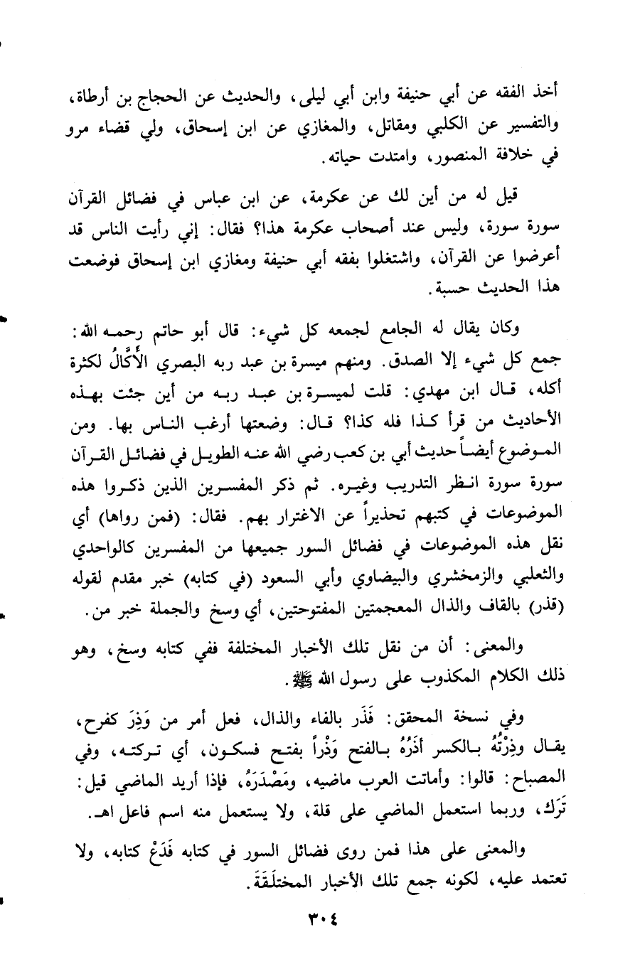 وكان يقال له الجامع لجمعه كل شيء: قال أبو حاتم رحمه الله: جمع كل شيء إلا الصدق. ومنهم ميسرة بن عبد ربه البصري الأكَّالُ لكثرة أكله، قال ابن مهدي: قلت لميسرة بن عبد ربه من أين جئت بهذه الأحاديث من قرأ كذا فله كذا؟ قال: وضعتها أرغب النَّاس بها. ومن الموضوع أيضاً حديث أبي بن كعب - رضي الله عنه - الطويل في فضائل القرآن سورة سورة انظر التدريب وغيره. ثم ذكر المفسرين الذين ذكروا هذه الموضوعات في كتبهم تحذيراً عن الاغترار بهم. فقال: (فمن رواها) أي نقل هذه الموضوعات في فضائل السور جميعها من المفسرين كالواحدي والثعلبي والزمخشري والبيضاوي وأبي السعود (في كتابه) خبر مقدم لقوله (قذر) بالقاف والذال المعجمتين المفتوحتين، أي وسخ والجملة خبر من.