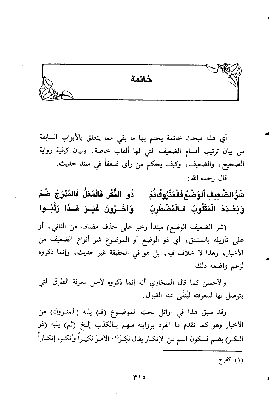 أي هذا مبحث خاتمة يختم بها ما بقي مما يتعلق بالأبواب السابقة من بيان ترتيب أقسام الضَّعِيف التي لها ألقاب خاصة، وبيان كيفية رواية الصَّحِيح، والضَّعِيف، وكيف يحكم من رأى ضعفاً في سند حديث.