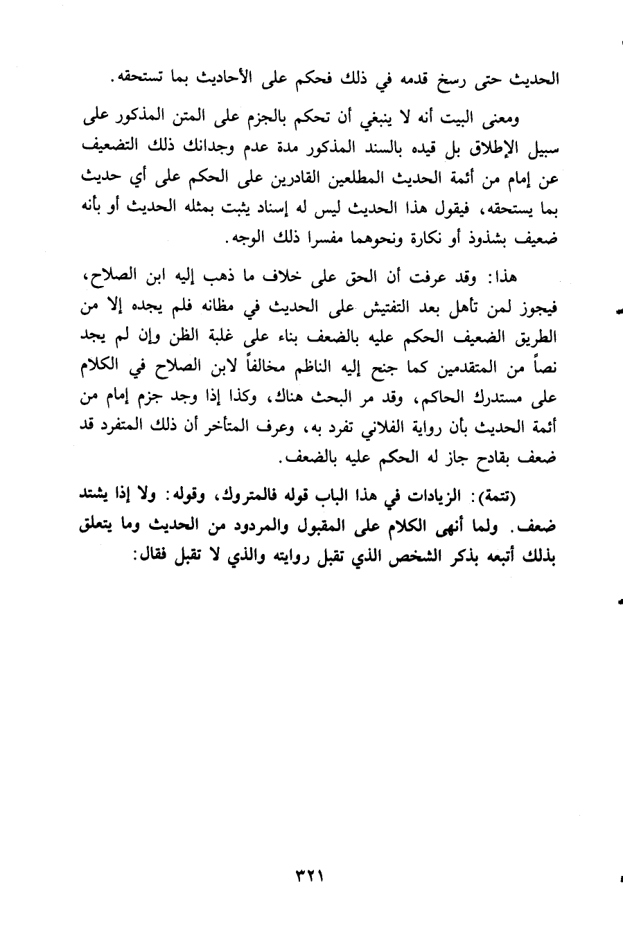 ومعنى البيت أنه لا ينبغي أن تحكم بالجزم على المتن المذكور على سبيل الإطلاق بل قيده بالسَّند المذكور مدة عدم وجدانك ذلك التضعيف عن إمام من أئمة الحديث المطلعين القادرين على الحكم على أي حديث بما يستحقه، فيقول هذا الحديث ليس له إسناد يثبت بمثله الحديث أو بأنه ضعيف بشذوذ أو نكارة ونحوهما مفسرا ذلك الوجه.