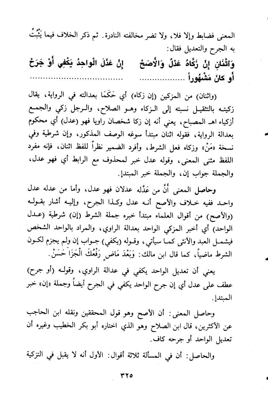 (واثنان) من المزكين (إن زكاه) أي حَكَمَا بعدالته في الرواية، يقال زكيته بالتثقيل نسبته إلى الزكاء وهو الصلاح، والرجل زكي والجمع أزكياء. اهـ المصباح، يعني أنه إن زكا شخصان راويا فهو (عدل) أي محكوم بعدالة الرواية، فقوله اثنان مبتدأ سوغه الوصف المذكور، وإن شرطية وفي نسخة " مَنْ " وزكاه فعل الشرط، وأفرد الضمير نظراً للفظ اثنان، فإنه مفرد اللفظ مثنى المعنى، وقوله عدل خبر لمحذوف مع الرابط أي فهو عدل، والجملة جواب إن، والجملة خبر المبتدإ.