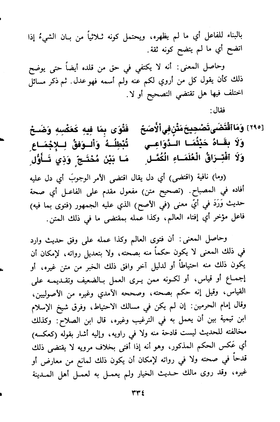 (وما) نافية (اقتضى) أي دل يقال اقتضى الأمر الوجوبَ أي دل عليه أفاده في المصباح. (تصحيح متن) مفعول مقدم على الفاعل أي صحة حديث وَرَدَ في أيّ معنى (في الأصح) الذي عليه الجمهور (فتوى بما فيه) فاعل مؤخر أي إفتاء العالم، وكذا عمله بمقتضى ما في ذلك المتن.