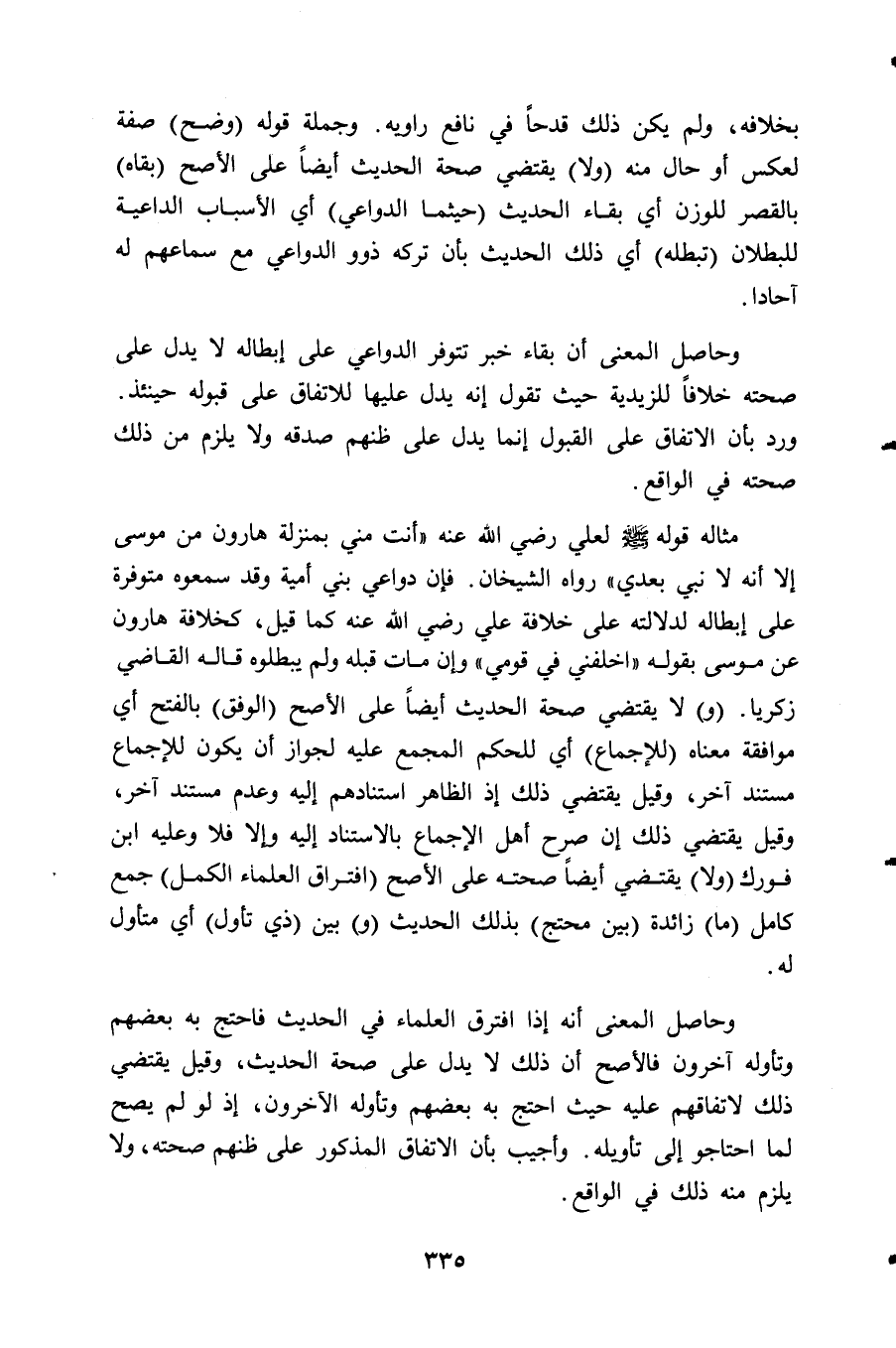 مثاله قوله - صلى الله عليه وسلم - لعلي - رضي الله عنه - " أنت مني بمنزلة هارون من موسى إلا أنه لا نبي بعدي " رواه الشيخان. فإن دواعي بني أمية وقد سمعوه متوفرة على إبطاله لدلالته على خلافة علي - رضي الله عنه - كما قيل، كخلافة هارون عن موسى بقوله " اخْلُفْنِي فِي قَوْمِي " وإن مات قبله ولم يبطلوه قاله القاضي زكريا. (و) لا يقتضي صحة الحديث أيضاً على الأصح (الوفق) بالفتح أي موافقة معناه (للإجماع) أي للحكم المجمع عليه لجواز أن يكون للإجماع مستند آخر، وقيل يقتضي ذلك إذ الظاهر استنادهم إليه وعدم مستند آخر، وقيل يقتضي ذلك إِن صرح أهل الإجماع بالاستناد إليه وإلا فلا وعليه ابن فورك (ولا) يقتضي أيضاً صحته على الأصح (افتراق العلماء الكمل) جمع كامل (ما) زائدة (بين محتج) بذلك الحديث (و) بين (ذي تأول) أي متأول له.