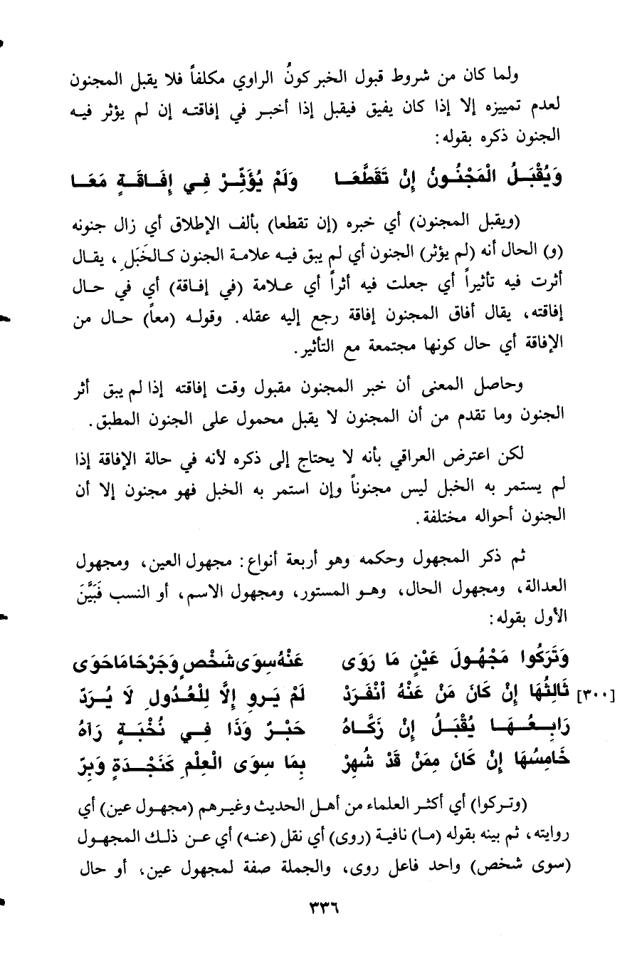 ثم ذكر المجهول وحكمه وهو أربعة أنواع: مجهول العين، ومجهول العدالة، ومجهول الحال، وهو المستور، ومجهول الاسم، أو النسب فَبَيَّنَ الأول بقوله: