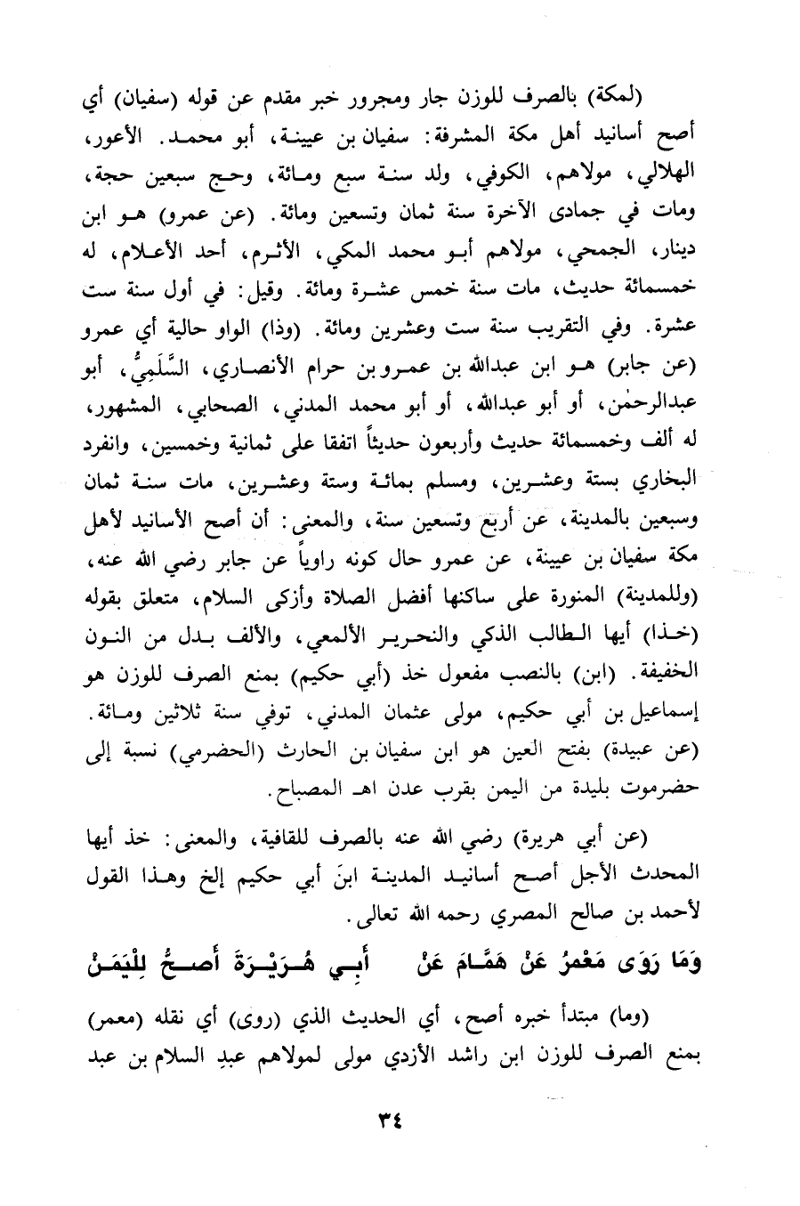 (لمكة) بالصرف للوزن جار ومجرور خبر مقدم عن قوله (سفيان) أي أصح أسانيد أهل مكة المشرفة: سفيان بن عيينة، أبو محمد. الأعور, الهلالي، مولاهم، الكوفي، ولد سنة سبع ومائة، وحج سبعين حجة, ومات في جمادى الآخرة سنة ثمان وتسعين ومائة. (عن عمرو) هو ابن دينار، الجمحي، مولاهم أبو محمد المكي، الأثرم، أحد الأعلام، له خمسمائة حديث، مات سنة خمس عشرة ومائة. وقيل: في أول سنة ست عشرة. وفي التقريب سنة ست وعشرين ومائة. (وذا) الواو حالية أي عمرو (عن جابر) هو ابن عبد الله بن عمرو بن حرام الأنصاري، السَّلَمِيُّ، أبو عبد الرحمن، أو أبو عبد الله، أو أبو محمد المدني، الصحابي، المشهور, له ألف وخمسمائة حديث وأربعون حديثاً اتفقا على ثمانية وخمسين، وانفرد البخاري بستة وعشرين، ومسلم بمائة وستة وعشرين، مات سنة ثمان وسبعين بالمدينة، عن أربع وتسعين سنة, والمعنى: أن أصح الأسانيد لأهل مكة سفيان بن عيينة، عن عمرو حال كونه راوياً عن جابر - رضي الله عنه - , (وللمدينة) المنورة على ساكنها أفضل الصلاة وأزكى السلام، متعلق بقوله (خذا) أيها الطالب الذكي والنحرير الألمعي، والألف بدل من النون الخفيفة. (ابن) بالنصب مفعول خذ (أبي حكيم) بمنع الصرف للوزن هو إسماعيل بن أبي حكيم، مولى عثمان المدني، توفي سنة ثلاثين ومائة.