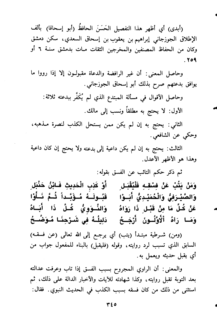 (أبدى) أي أظهر هذا التفصيل الحَسَنَ الحافظُ (أبو إسحاقا) بألف الإطلاق الجوزجاني إبراهيم بن يعقوب بن إسحاق السعدي، سكن دمشق وكان من الحفاظ المصنفين والمخرجين الثقات مات بدمشق سنة 6 أو 259.