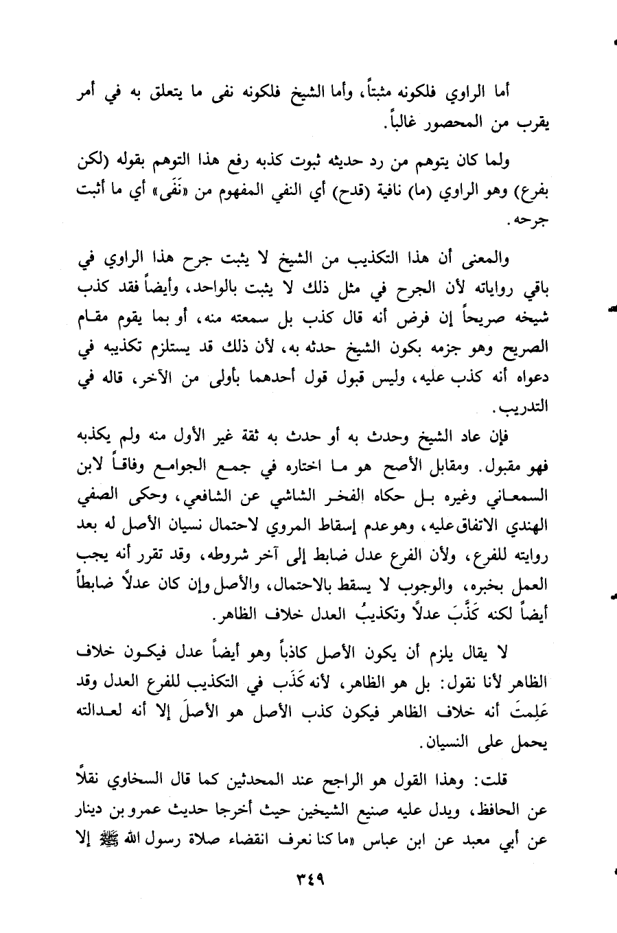 لا يقال يلزم أن يكون الأصل كاذباً وهو أيضاً عدل فيكون خلاف الظاهر لأنا نقول: بل هو الظاهر، لأنه كَذَب في التكذيب للفرع العدل وقد عَلِمتَ أنه خلاف الظاهر فيكون كذب الأصل هو الأصلَ إلا أنه لعدالته يحمل على النسيان.