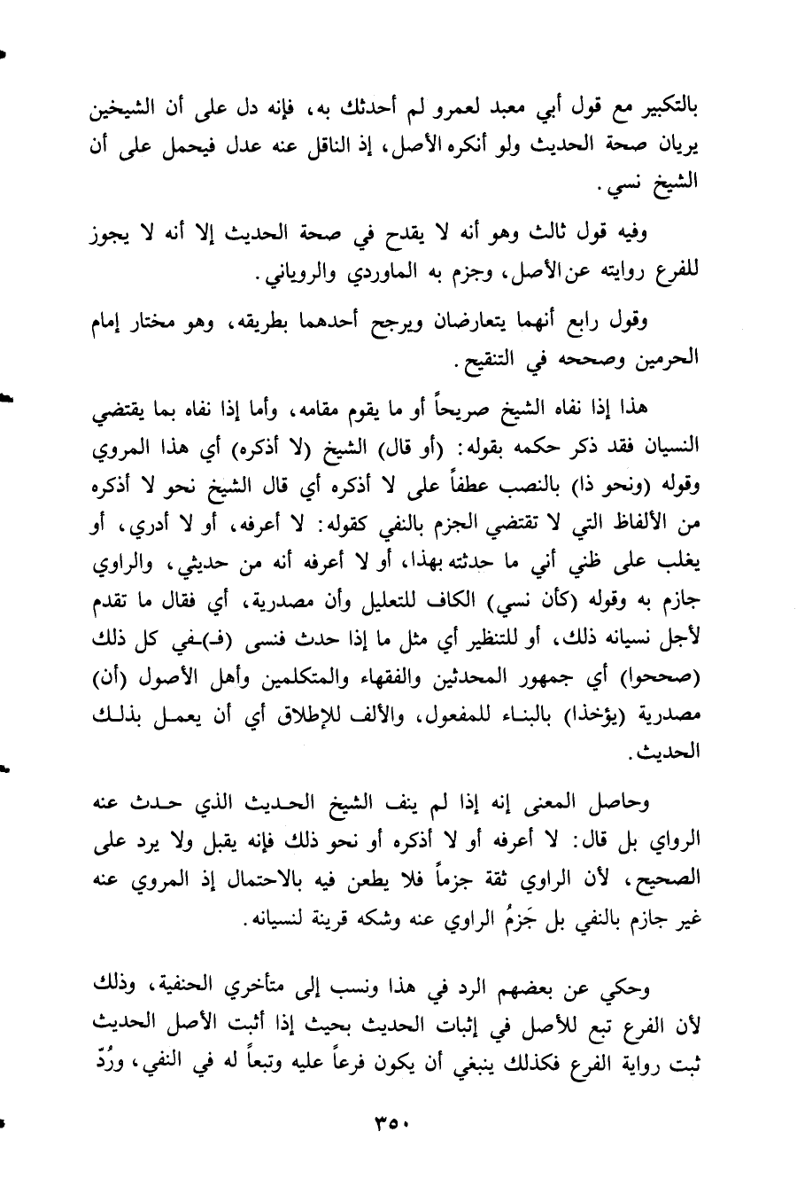 الرواي بل قال: لا أعرفه أو لا أذكره أو نحو ذلك فإنه يقبل ولا يرد على الصَّحِيح، لأن الراوي ثقة جزماً فلا يطعن فيه بالاحتمال إذ المروي عنه غير جازم بالنفي بل جَزمُ الراوي عنه وشكه قرينة لنسيانه.