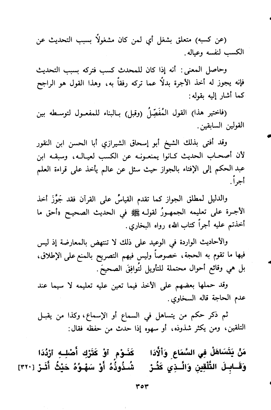 وحاصل المعنى: أنه إذا كان للمحدث كسب فتركه بسبب التحديث فإنه يجوز له أخذ الأجرة بدلاً عما تركه رفقاً به، وهذا القول هو الراجح كما أشار إليه بقوله:
