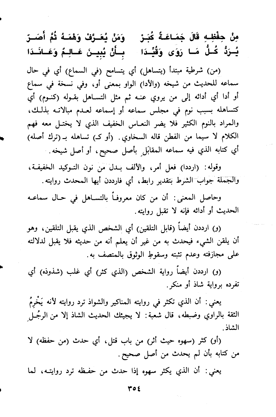 (من) شرطية مبتدأ (يتساهل) أي يتسامح (في السماع) أي في حال سماعه للحديث من شيخه (والأدا) الواو بمعنى أو، وفي نسخة في سماع أو أدا أي أدائه إلى من يروي عنه ثم مثل التساهل بقوله (كنوم) أي كتساهله بسبب نوم في مجلس سماعه أو إسماعه لعدم مبالاته بذلك، والمراد بالنوم الكثير فلا يضر النعاس الخفيف الذي لا يختل معه فهم الكلام لا سيما من الفطن قاله السخاوي. (أو كـ) تساهله بـ (ترك أصله) أي كتابه الذي فيه سماعه المقابَلِ بأصل صحيح، أو أصل شيخه.