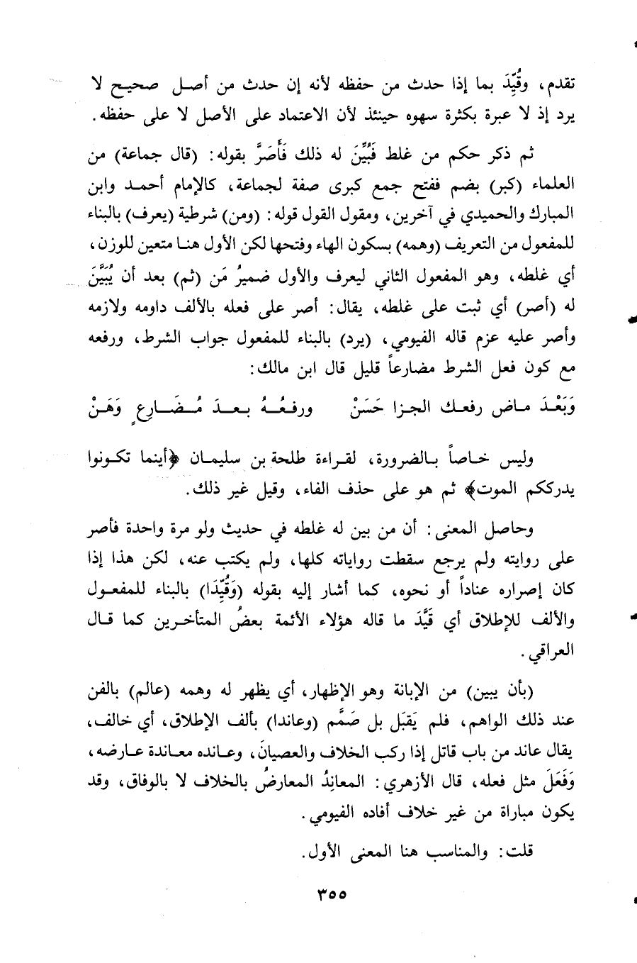 ثم ذكر حكم من غلط فَبُيِّنَ له ذلك فَأصَرَّ بقوله: (قال جماعة) من العلماء (كَبُرْ) بضم ففتح جمع كبرى صفة لجماعة، كالإمام أحمد وابن المبارك والحميدي في آخرين، ومقول القول قوله: (ومن) شرطية (يعرف) بالبناء للمفعول من التعريف (وهمه) بسكون الهاء وفتحها لكن الأول هنا متعين للوزن، أي غلطه، وهو المفعول الثاني ليعرف والأول ضميرُ مَن (ثم) بعد أن يُبَيَّنَ له (أصر) أي ثبت على غلطه، يقال: أصر على فعله بالألف داومه ولازمه وأصر عليه عزم قاله الفيومي، (يرد) بالبناء للمفعول جواب الشرط، ورفعه مع كون فعل الشرط مضارعاً قليل قال ابن مالك: