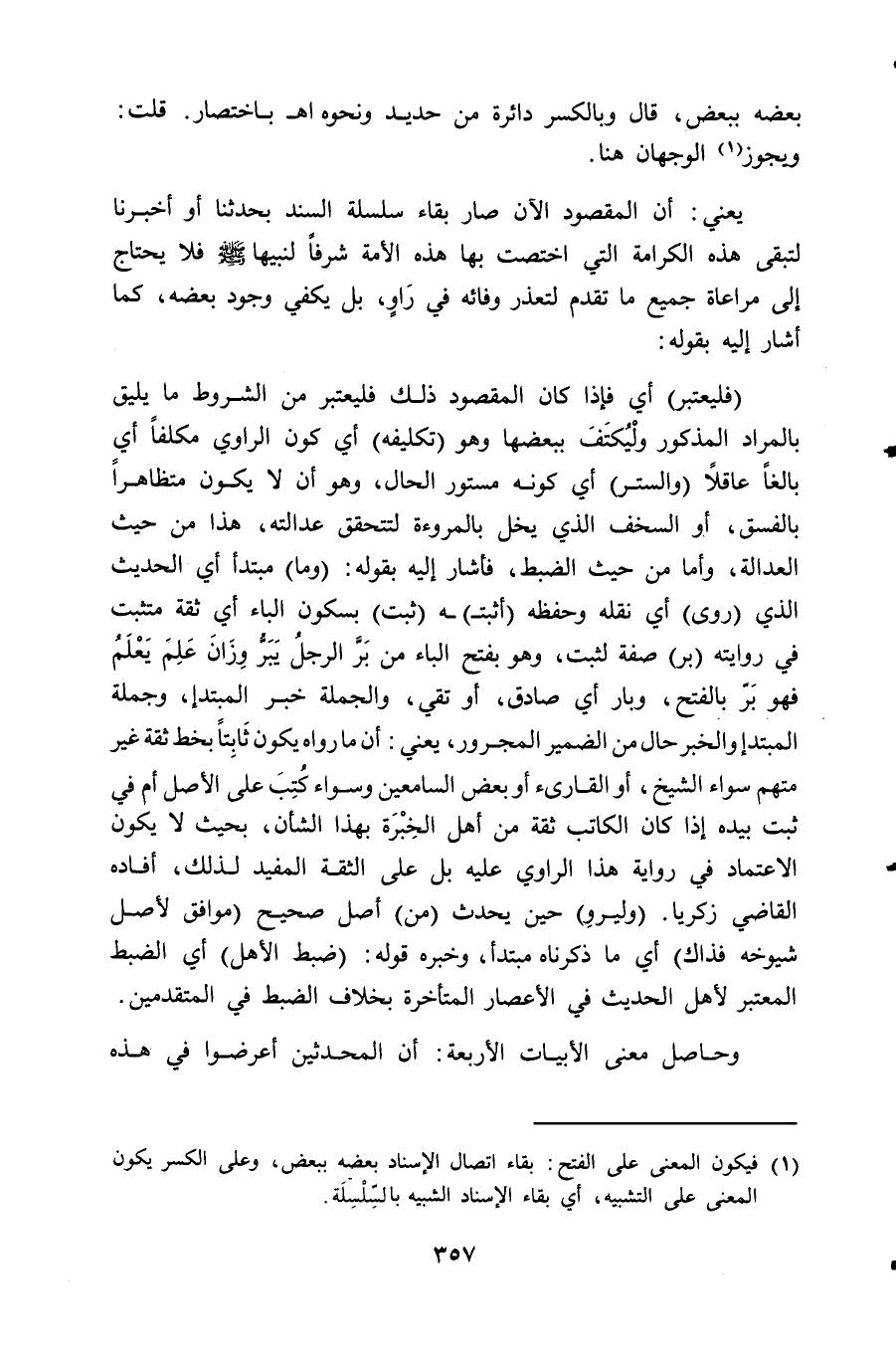 (¬1) فيكون المعنى على الفتح: بقاء اتصال الإسناد بعضه ببعض، وعلى الكسر يكون المعنى على التشبيه، أي بقاء الإسناد الشبيه بالسِّلْسِلَة.