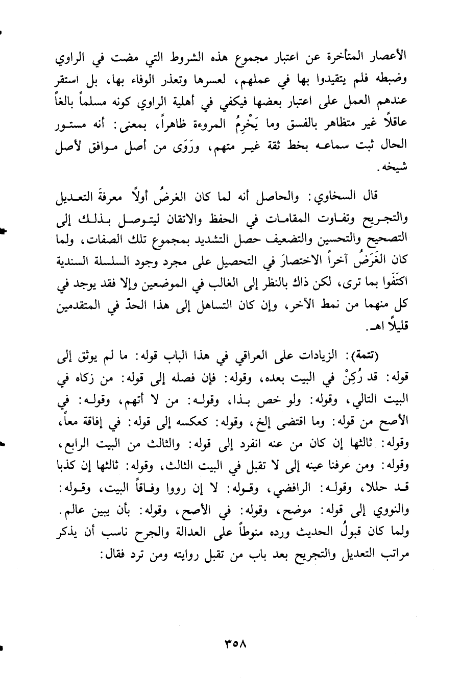 (تَتِمَّة): الزيادات على العراقي في هذا الباب قوله: ما لم يوثق إلى قوله: قد رُكِنْ في البيت بعده، وقوله: فإن فصله إلى قوله: من زكاه في البيت التالي، وقوله: ولو خص بذا، وقوله: من لا أتهم، وقوله: في الأصح من قوله: وما اقتضى إلخ، وقوله: كعكسه إلى قوله: في إفاقة معاً، وقوله: ثالثها إن كان من عنه انفرد إلى قوله: والثالث من البيت الرابع، وقوله: ومن عرفنا عينه إلى لا تقبل في البيت الثالث، وقوله: ثالثها إن كذبا قد حللا، وقوله: الرافضي، وقوله: لا إن رووا وفاقاً البيت، وقوله: والنووي إلى قوله: موضح، وقوله: في الأصح، وقوله: بأن يبين عالم.