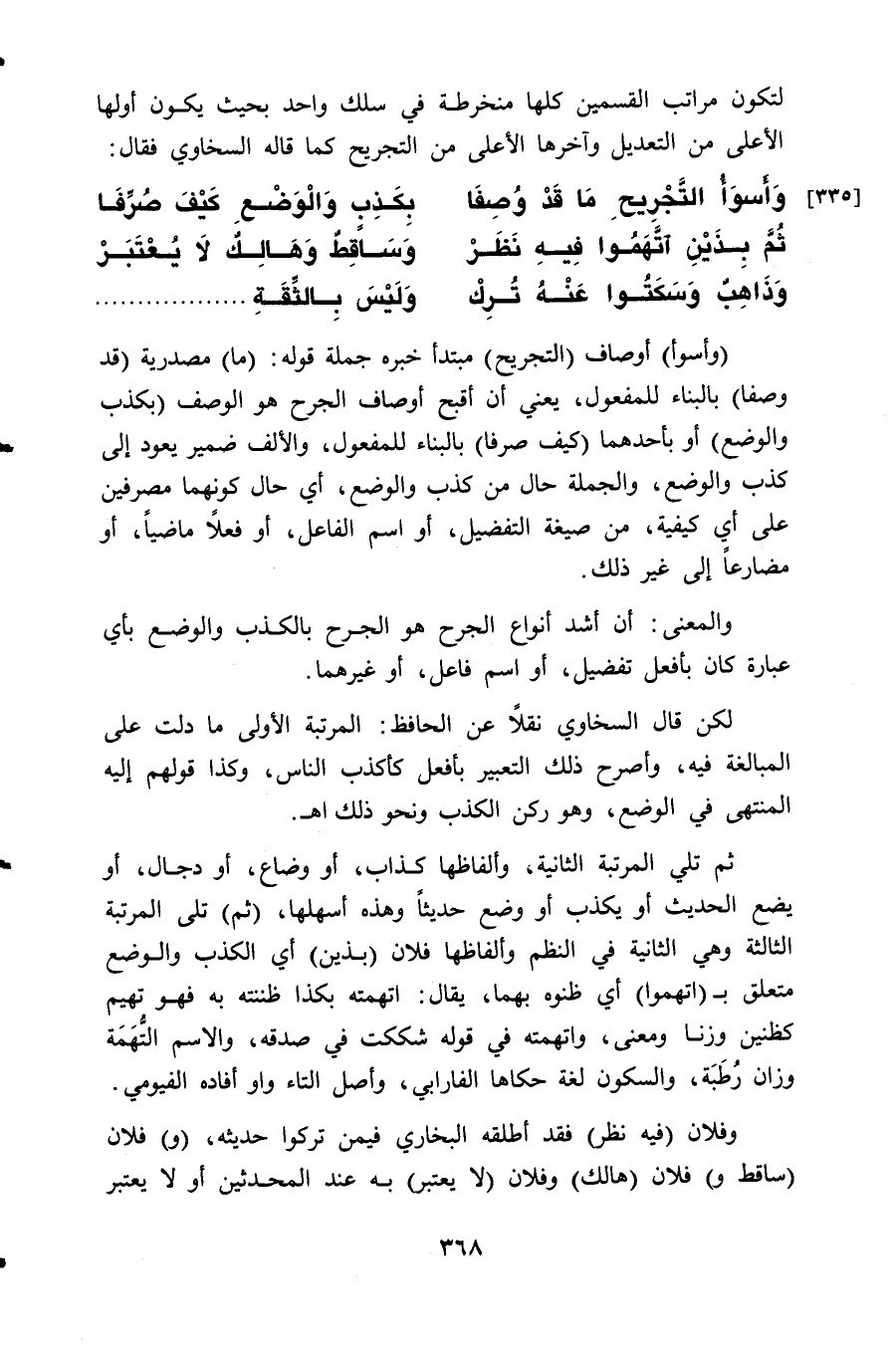 (وأسوأ) أوصاف (التجريح) مبتدأ خبره جملة قوله: (ما) مصدرية (قد وصفا) بالبناء للمفعول، يعني أن أقبح أوصاف الجرح هو الوصف (بكذب والوضع) أو بأحدهما (كيف صرفا) بالبناء للمفعول، والألف ضمير يعود إلى كذب والوضع، والجملة حال من كذب والوضع، أي حال كونهما مصرفين على أي كيفية، من صيغة التفضيل، أو اسم الفاعل، أو فعلاً ماضياً، أو مضارعاً إلى غير ذلك.