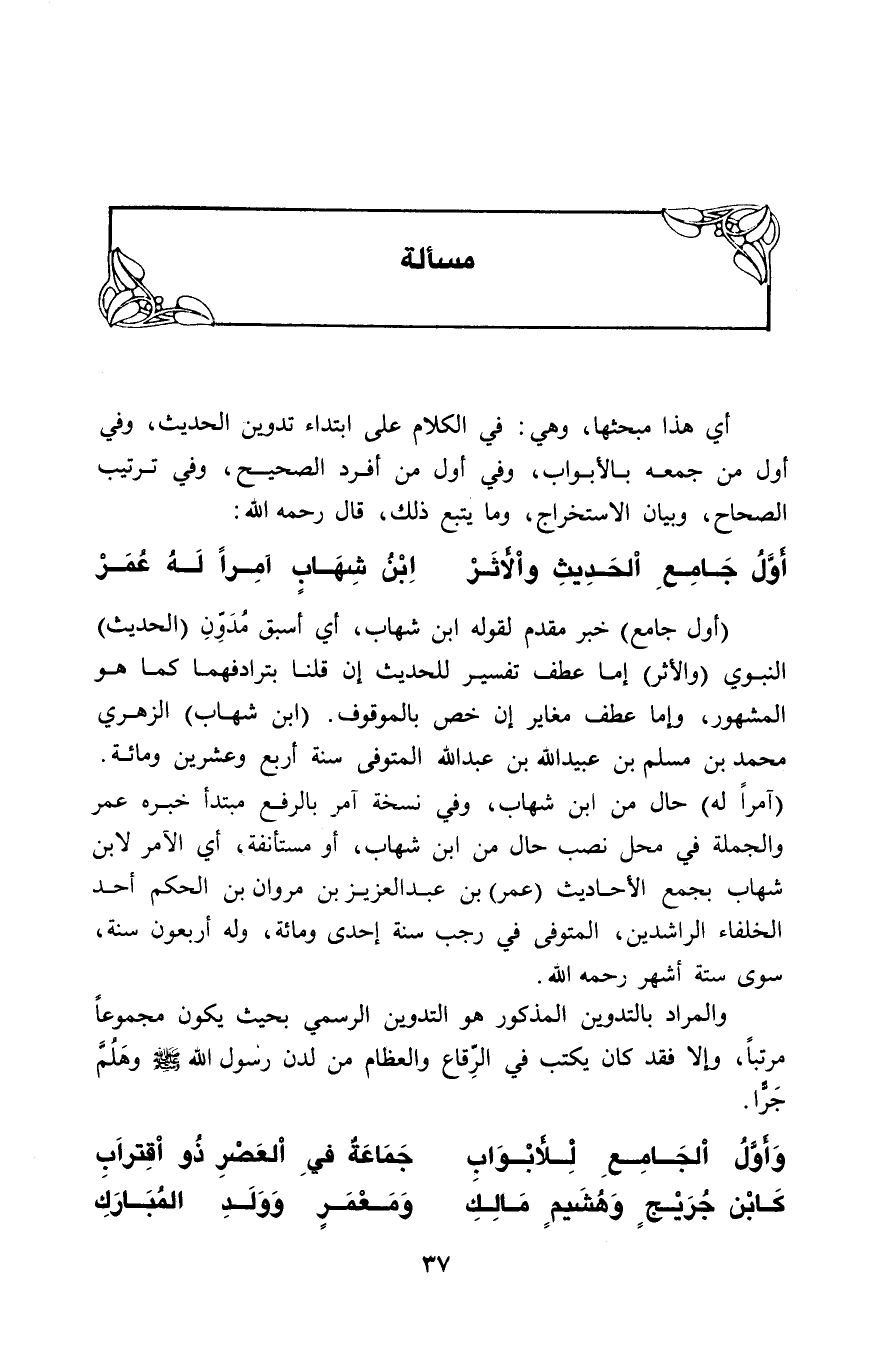 (أول جامع) خبر مقدم لقوله ابن شهاب، أي أسبق مُدَوِّنِ (الحديث) النبوي (والأثر) إما عطف تفسير للحديث إن قلنا بترادفهما كما هو المشهور، وإما عطف مغاير إن خص بالموقوف. (ابن شهاب) الزهري محمد بن مسلم بن عبيد الله بن عبد الله المتوفي سنة أربع وعشرين ومائة.