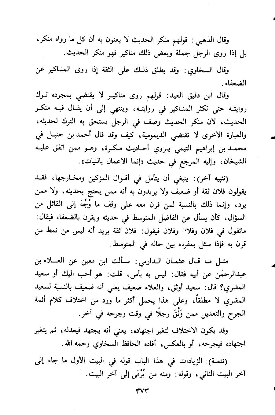 وقال ابن دقيق العيد: قولهم روى مناكير لا يقتضي بمجرده ترك روايته حتى تكثر المناكير في روايته، وينتهي إلى أن يقال فيه منكر الحديث، لأن منكر الحديث وصف في الرجل يستحق به الترك لحديثه، والعبارة الأخرى لا تقتضي الديمومية، كيف وقد قال أحمد بن حنبل في محمد بن إبراهيم التيمي يروي أحاديث منكرة، وهو ممن اتفق عليه الشيخان، وإليه المرجع في حديث " إنما الأعمال بالنيات ".