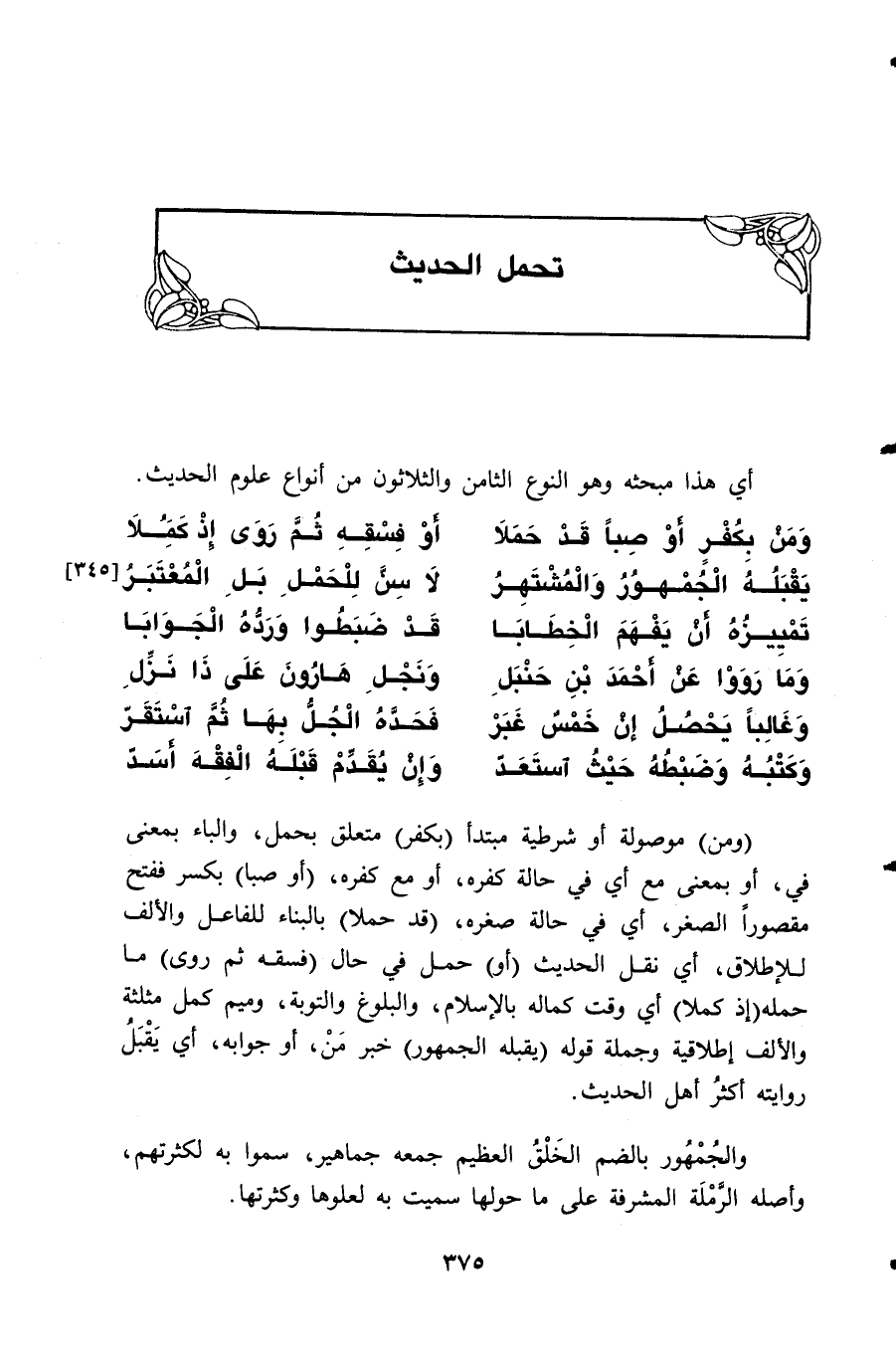 (وَمَنْ) موصولة أو شرطية مبتدأ (بِكُفْرٍ) متعلق بحمل، والباء بمعنى في، أو بمعنى مع أي في حالة كفره، أو مع كفره، (أو صبا) بكسر ففتح مقصوراً الصغر، أي في حالة صغره، (قد حملا) بالبناء للفاعل والألف للإطلاق، أي نقل الحديث (أو) حمل في حال (فسقه ثم روى) ما حمله (إذ كملا) أي وقت كماله بالإسلام، والبلوغ والتوبة، وميم كمل مثلثة والألف إطلاقية وجملة قوله (يقبله الجمهور) خبر مَنْ، أو جوابه، أي يَقْبَلُ روايته أكثرُ أهل الحديث.