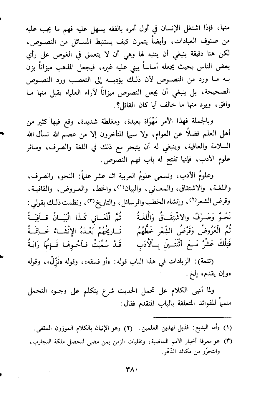 وعلومُ الأدب، وتسمى علومُ العربية اثنا عشر علماً: النحو، والصرف، واللغة، والاشتقاق، والمعاني، والبيان (¬1)، والخط، والعروض، والقافية، وقرض الشعر (¬2)، وإنشاء الخطب والرسائل، والتاريخ (¬3)، ونظمت ذلك بقولي: