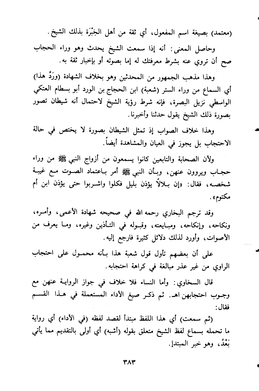 ولأن الصحابة والتابعين كانوا يسمعون من أزواج النبي - صلى الله عليه وسلم - من وراء حجاب ويروون عنهن، وبأن النبي - صلى الله عليه وسلم - أمر باعتماد الصوت مع غيبة شخصه، فقال: " إن بلالًا يؤذن بليل فكلوا واشربوا حتى يؤذن ابن أم مكتوم ".