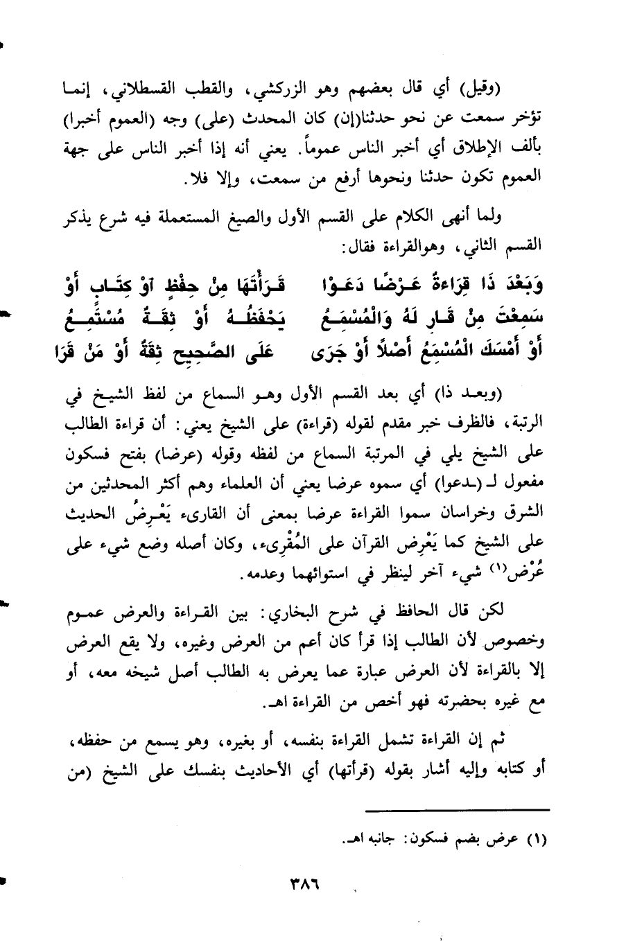 (وبعد ذا) أي بعد القسم الأول وهو السماع من لفظ الشيخ في الرتبة، فالظرف خبر مقدم لقوله (قراءة) على الشيخ يعني: أن قراءة الطالب على الشيخ يلي في المرتبة السماع من لفظه وقوله (عرضا) بفتح فسكون مفعول لـ (دعوا) أي سموه عرضا يعني أن العلماء وهم أكثر المحدثين من الشرق وخراسان سموا القراءة عرضا بمعنى أن القارئ يَعْرِضُ الحديث على الشيخ كما يَعْرِض القرآن على المُقْرِئ، وكان أصله وضع شيء على عُرْض (¬1) شيء آخر لينظر في استوائهما وعدمه.