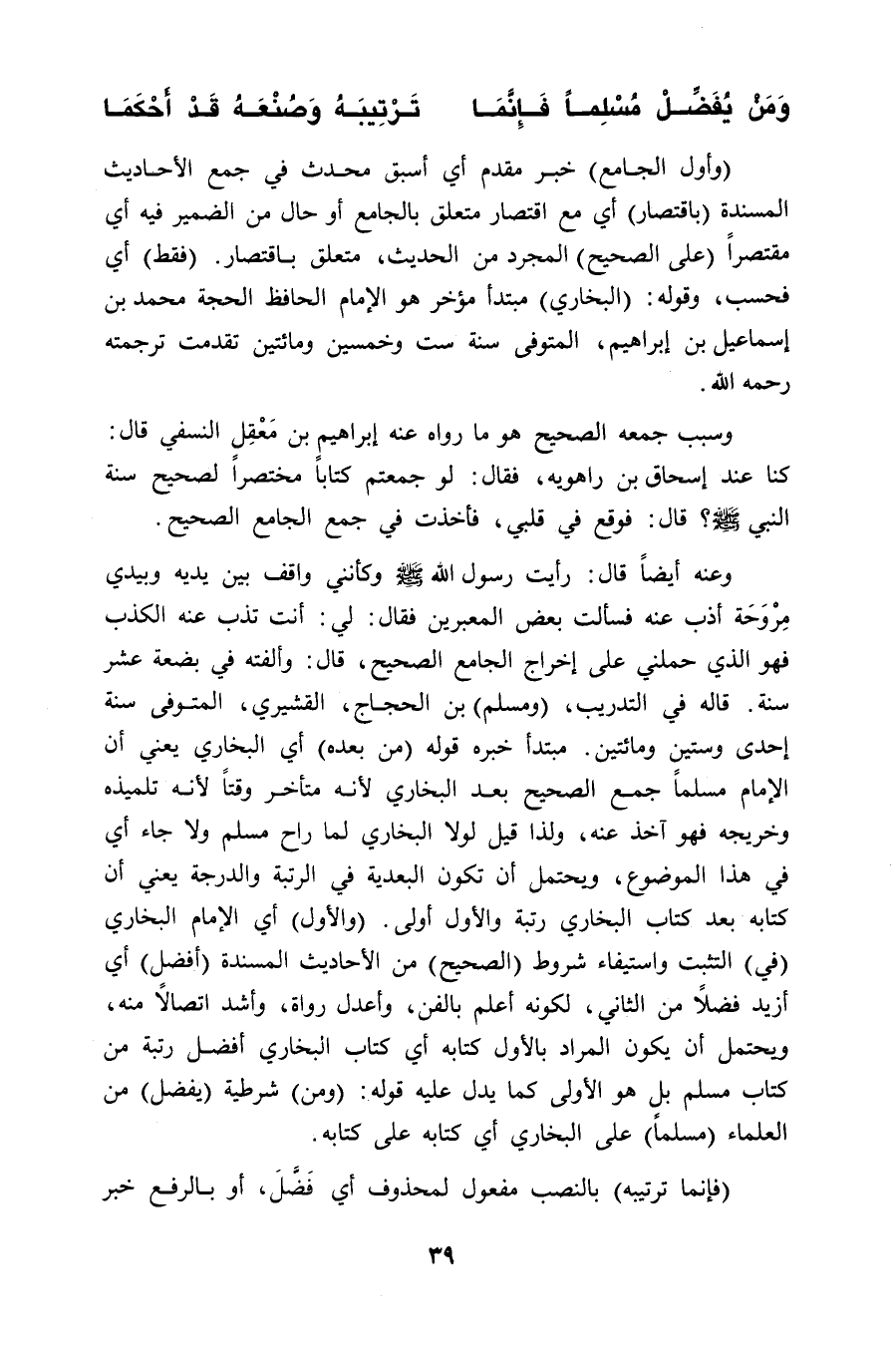وعنه أيضاً قال: رأيت رسول الله - صلى الله عليه وسلم - وكأنني واقف بين يديه وبيدي مِرْوَحَة أذب عنه فسألت بعض المعبرين فقال: لي: أنت تذب عنه الكذب فهو الذي حملني على إخراج الجامع الصَّحِيح، قال: وألفته في بضعة عشر سنة قاله في التدريب. (ومسلم) بن الحجاج، القشيري، المتوفى سنة إحدى وستين ومائتين. مبتدأ خبره قوله (من بعده) أي البخاري يعني أن الإمام مسلماً جمع الصَّحِيح بعد البخاري لأنه متأخر وقتاً لأنه تلميذه وخريجه فهو آخذ عنه، ولذا قيل لولا البخاري لما راح مسلم ولا جاء أي في هذا الموضوع، ويحتمل أن تكون البعدية في الرتبة والدرجة يعني أن كتابه بعد كتاب البخاري رتبة والأول أولى. (والأول) أي الإمام البخاري (في) التثبت واستيفاء شروط (الصَّحِيح) من الأحاديث المسندة (أفضل) أي أزيد فضلاً من الثاني، لكونه أعلم بالفن، وأعدل رواة، وأشد اتصالًا منه, ويحتمل أن يكون المراد بالأول كتابه أي كتاب البخاري أفضل رتبة من كتاب مسلم بل هو الأولى كما يدل عليه قوله: (ومن) شرطية (يفضل) من العلماء (مسلماً) على البخاري أي كتابه على كتابه.