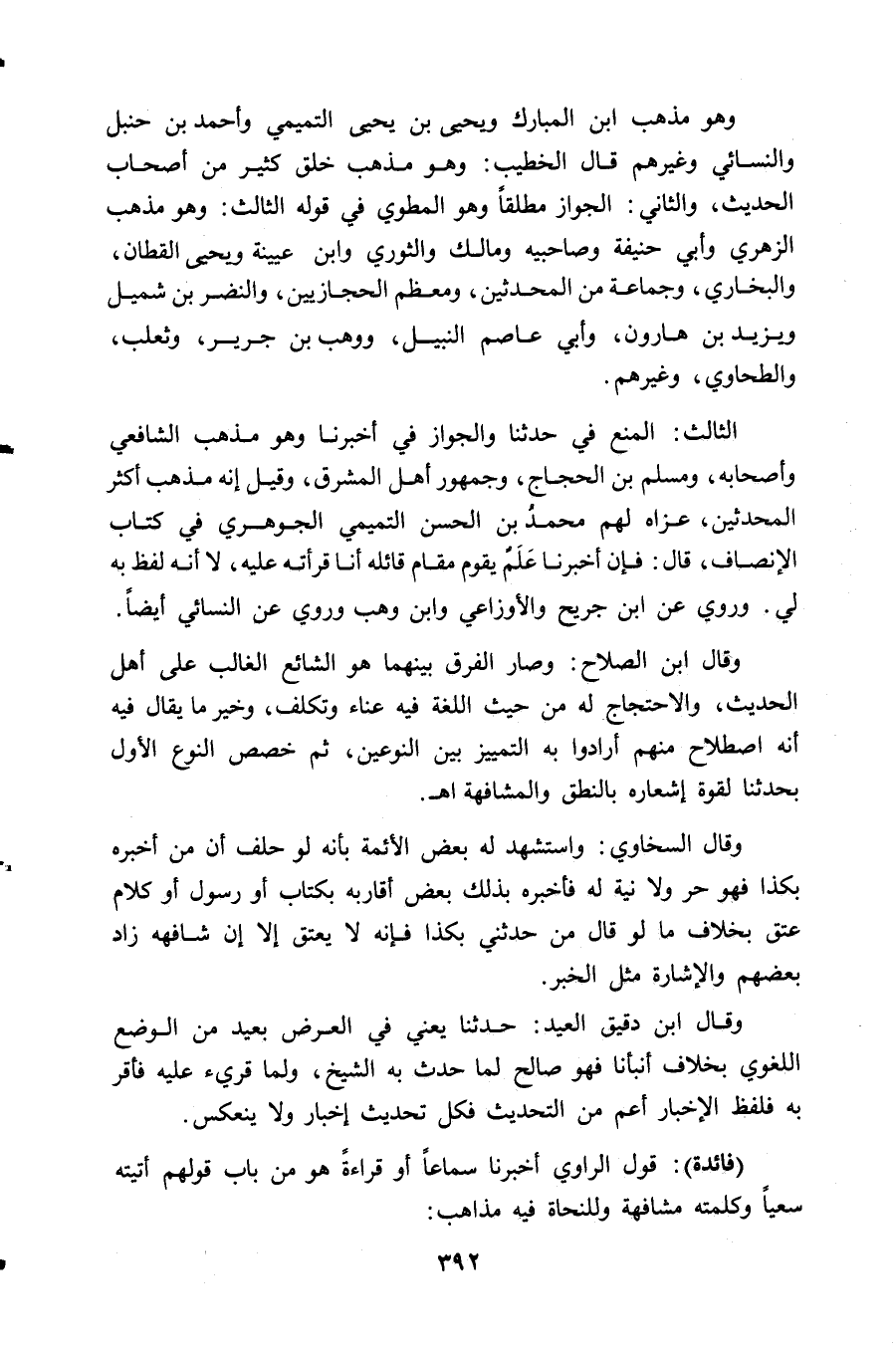 وهو مذهب ابن المبارك وَيَحْيَى بن يَحْيَى التميمي وأحمد بن حنبل والنسائي وغيرهم قال الخطيب: وهو مذهب خلق كثير من أصحاب الحديث، والثاني: الجواز مطلقاً وهو المطوي في قوله الثالث: وهو مذهب الزهري وأبي حنيفة وصاحبيه ومالك والثَّوري وابن عيينة وَيَحْيَى القطان، والبخاري، وجماعة من المحدثين، ومعظم الحجازيين، والنضر بن شميل ويزيد بن هارون، وأبي عاصم النبيل، ووهب بن جرير، وثعلب، والطحاوي، وغيرهم.