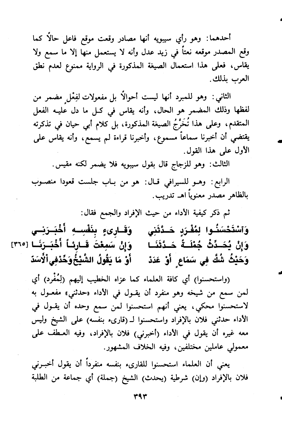 الثاني: وهو للمبرد أنها ليست أحوالاً بل مفعولات لفِعْل مضمر من لفظها وذلك المضمر هو الحال، وأنه يقاس في كل ما دل عليه الفعل المتقدم، وعلى هذا تُخَرَّجُ الصيغة المذكورة، بل كلام أبي حيان في تذكرته يقتضي أن أخبرنا سماعاً مسموع، وأخبرنا قراءة لم يسمع، وأنه يقاس على الأول على هذا القول.