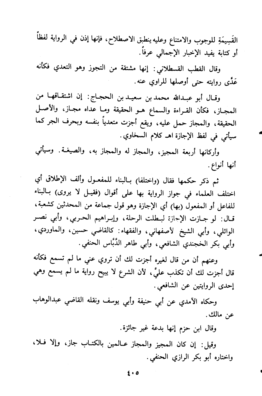 ثم ذكر حكمها فقال (واختلفا) بالبناء للمفعول وألف الإطلاق أي اختلف العلماء في جواز الرواية بها على أقوال (فقيل لا يروى) بالبناء للفاعل أو المفعول (بها) أي الإجازة وهو قول جماعة من المحدثين كشعبة، قال: لو جازت الإجازة لبطلت الرحلة، وإبراهيم الحربي، وأبي نصر الوائلي، وأبي الشيخ لأصفهاني، والفقهاء: كالقاضي حسين، والماوردي، وأبي بكر الخجندي الشافعي، وأبي طاهر الدَّبَّاس الحنفي.