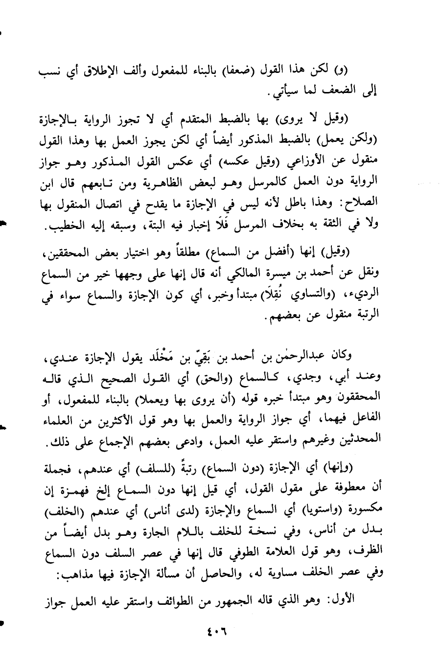 (وقيل لا يروى) بها بالضبط المتقدم أي لا تجوز الرواية بالإجازة (ولكن يعمل) بالضبط المذكور أيضاً أي لكن يجوز العمل بها وهذا القول منقول عن الأوزاعي (وقيل عكسه) أي عكس القول المذكور وهو جواز الرواية دون العمل كالمرسل وهو لبعض الظاهرية ومن تابعهم قال ابن الصلاح: وهذا باطل لأنه ليس في الإجازة ما يقدح في اتصال المنقول بها ولا في الثقة به بخلاف المرسل فَلَا إخبار فيه البتَّةَ، وسبقه إليه الخطيب.