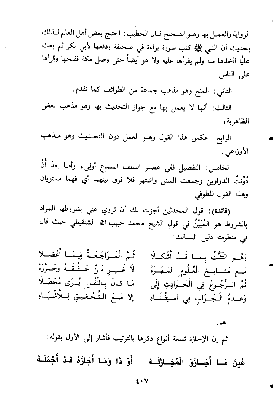(فائدة): قول المحدثين أجزت لك أن تروي عني بشروطها المراد بالشروط هو المُبَيَّنُ في قول الشيخ محمد حبيب الله الشنقيطي حيث قال في منظومته دليل السالك: