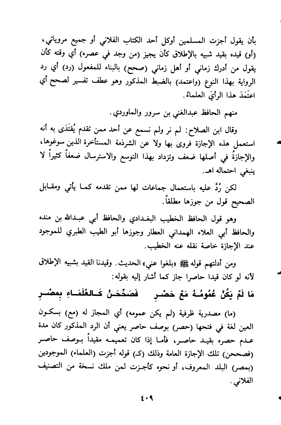 بأن يقول أجزت المسلمين أوكل أحد الكتاب الفلاني أو جميع مروياتي، (أو) قيده بقيد شبيه بالإطلاق كان يجيز (من وجد في عصره) أي وقته كأن يقول من أدرك زماني أو أهل زماني (صحح) بالبناء للمفعول (رد) أي رد الرواية بهذا النوع (واعتمد) بالضبط المذكور وهو عطف تفسير لصحح أي اعتَمَدَ هذا الرأيَ العلماءُ.