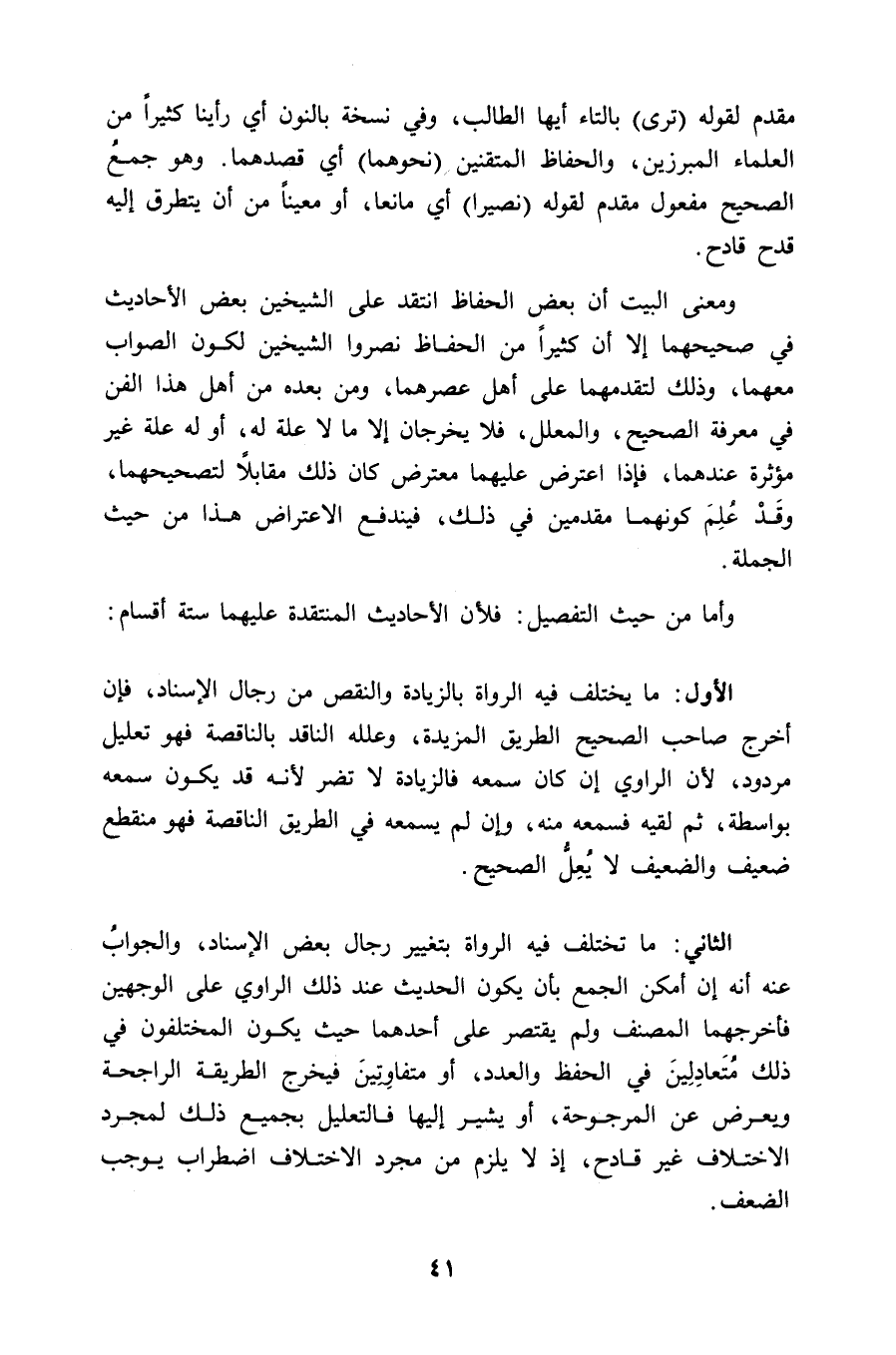 وأما من حيث التفصيل: فلأن الأحاديث المنتقدة عليهما ستة أقسام: الأول: ما يختلف فيه الرواة بالزيادة والنقص من رجال الإسناد, فإن أخرج صاحب الصَّحِيح الطريق المزيدة، وعلله الناقد بالناقصة فهو تعليل مردود، لأن الراوي إن كان سمعه فالزيادة لا تضر لأنه قد يكون سمعه بواسطة، ثم لقيه فسمعه منه، وإن لم يسمعه في الطريق الناقصة فهو منقطع ضعيف والضَّعِيف لا يُعِلُّ الصَّحِيح.