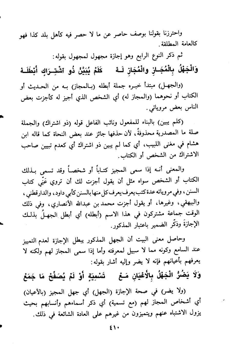 وحاصل معنى البيت أن الجهل المذكور يبطل الإجازة لعدم التمييز عند السامع وكونه مما لا سبيل لمعرفته وأما إذا سمى المجاز لهم ولكنه لا يعرفهم بأعيانهم فإنه لا يضر وإليه أشار بقوله: