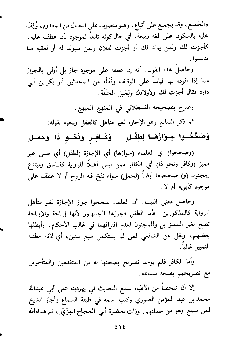 وحاصل معنى البيت: أن العلماء صححوا جواز الإجازة لغير متأهل للرواية كالمذكورين. فأما الطفل فجوزها الجمهور لأنها إباحة والإباحة تصح لغير المميز بل وللمجنون لعدم افتراقهما في غالب الأحكام، وأبطلها بعضهم، ونقل عن الشافعي لمن لم يستكمل سبع سنين، أي لأنه مظنة التمييز غالباً.