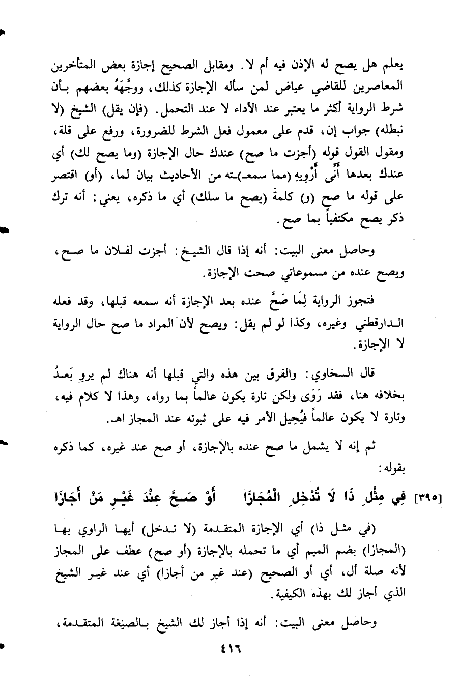 يعلم هل يصح له الإذن فيه أم لا. ومقابل الصَّحِيح إجازة بعض المتأخرين المعاصرين للقاضي عياض لمن سأله الإجازة كذلك، ووجَّهَهُ بعضهم بأن شرط الرواية أكَثر ما يعتبر عند الأداء لا عند التحمل. (فإن يقل) الشيخ (لا نبطله) جواب إن، قدم على معمول فعل الشرط للضرورة، ورفع على قلة، ومقول القول قوله (أجزت ما صح) عندك حال الإجازة (وما يصح لك) أي عندك بعدها أنِّي أروِيهِ (مما سمعـ) ـته من الأحاديث بيان لما، (أو) اقتصر على قوله ما صح (و) كلمةَ (يصح ما سلك) أي ما ذكره، يعني: أنه ترك ذكر يصح مكتفيا بما صح.