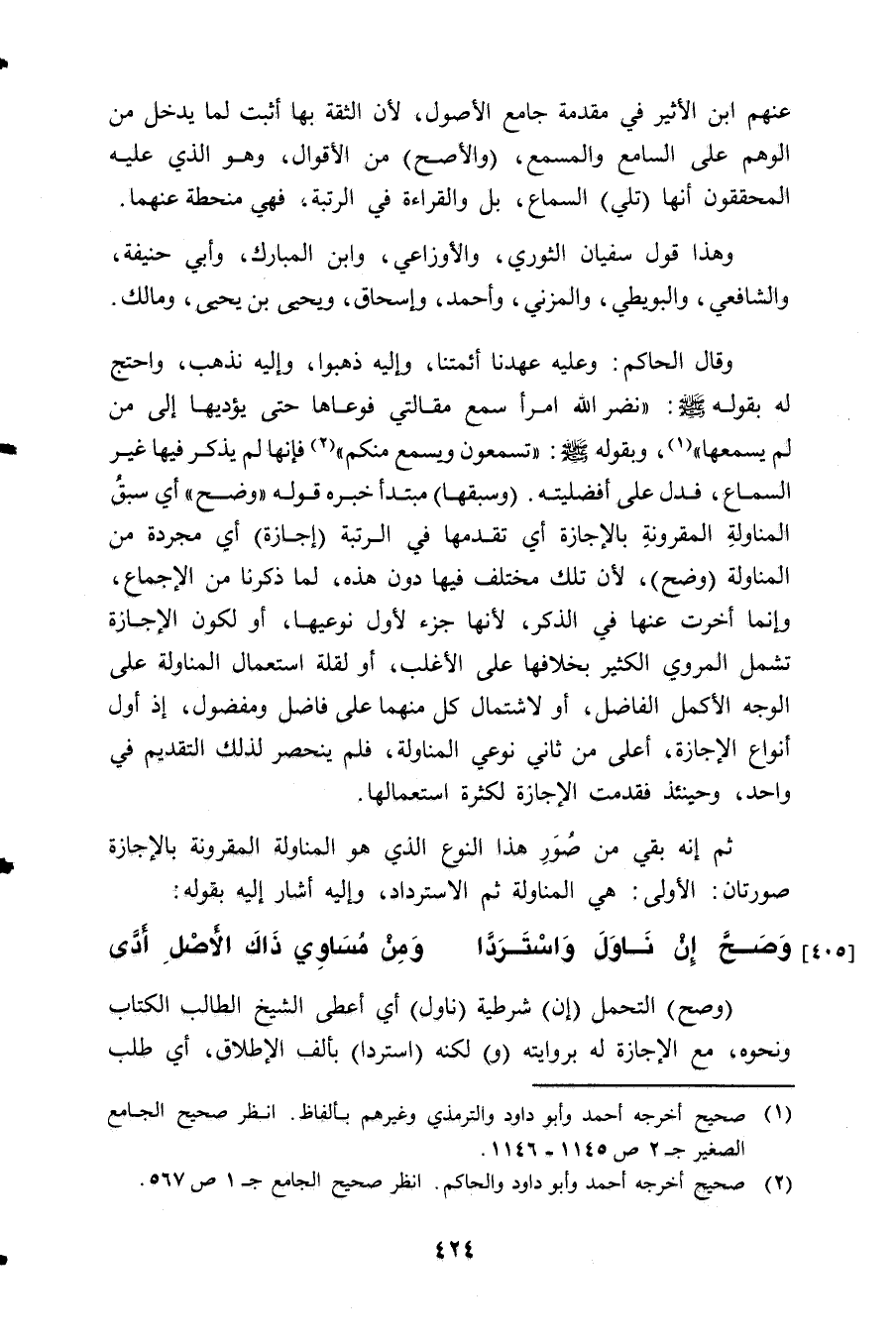 وقال الحاكم: وعليه عهدنا أئمتنا، وإليه ذهبوا، وإليه نذهب، واحتج له بقوله - صلى الله عليه وسلم -: " نضر الله امراً سمع مقالتي فوعاها حتى يؤديها إلى من لم يسمعها " (¬1)، وبقوله - صلى الله عليه وسلم -: " تسمعون ويسمع منكم " (¬2) فإنها لم يذكر فيها غير السماع، فدل على أفضليته. (وسبقها) مبتدأ خبره قوله " وضح " أي سبقُ المناولةِ المقرونةِ بالإجازة أي تقدمها في الرتبة (إجازة) أي مجردة من المناولة (وضح)، لأن تلك مختلف فيها دون هذه، لما ذكرنا من الإجماع، وإنما أخرت عنها في الذكر، لأنها جزء لأول نوعيها، أو لكون الإجازة تشمل المروي الكثير بخلافها على الأغلب، أو لقلة استعمال المناولة على الوجه الأكمل الفاضل، أو لاشتمال كل منهما على فاضل ومفضول، إذ أول أنواع الإجازة، أعلى من ثاني نوعي المناولة، فلم ينحصر لذلك التقديم في واحد، وحينئذ فقدمت الإجازة لكثرة استعمالها.