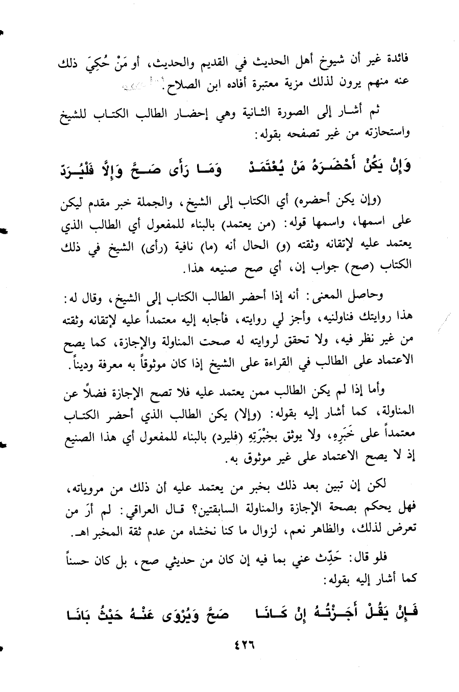 وحاصل المعنى: أنه إذا أحضر الطالب الكتاب إلىِ الشيخ، وقال له: هذا روايتك فناولنيه، وأجز لي روايته، فأجابه إليه معتمداً عليه لإتقانه وثقته من غير نظر فيه، ولا تحقق لروايته له صحت المناولة والإجازة، كما يصِح الاعتماد على الطالب في القراءة على الشيخ إذا كان موثوقاً به معرفة وديناً.