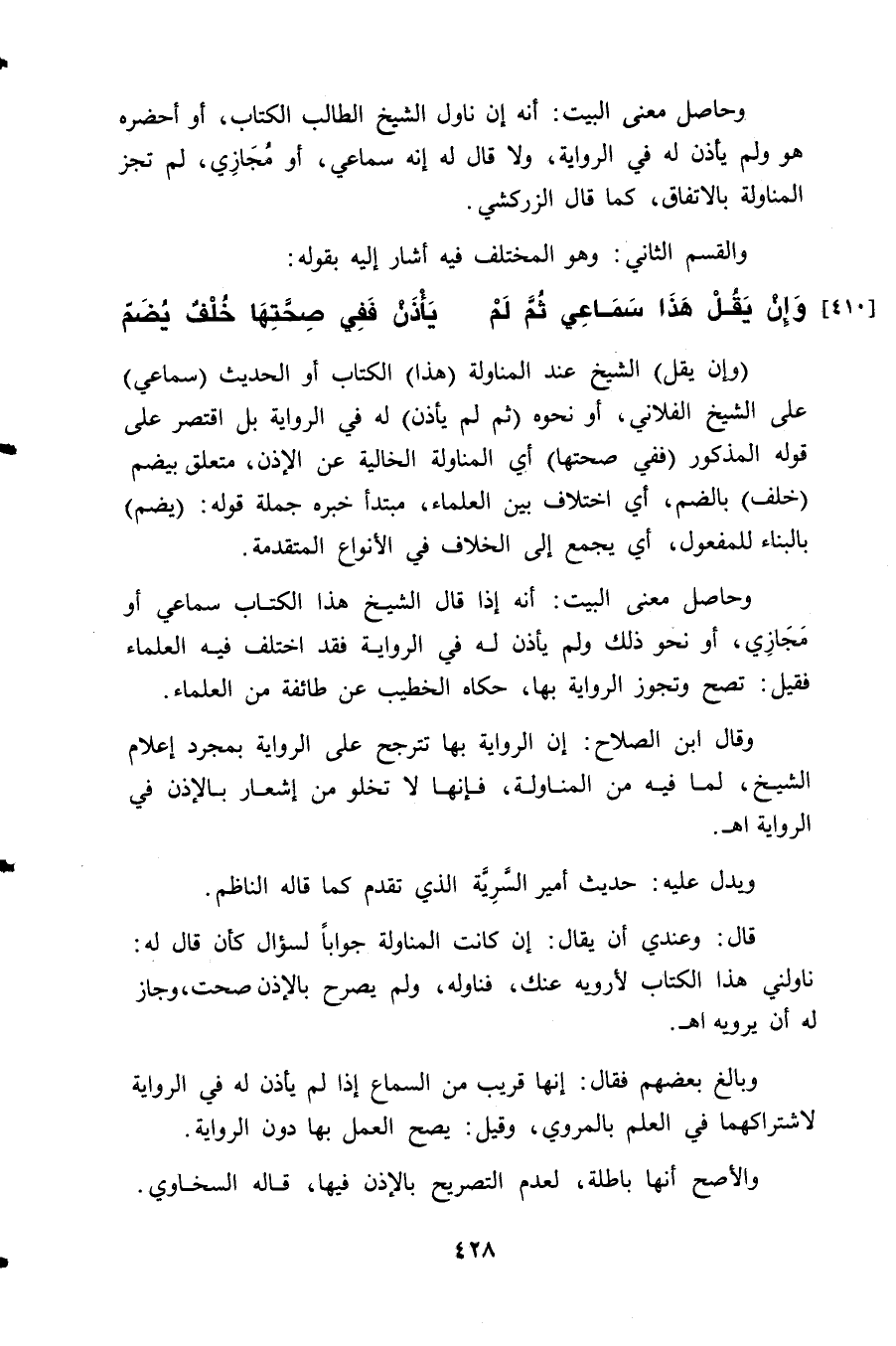 وحاصل معنى البيت: أنه إذا قال الشيخ هذا الكتاب سماعي أو مَجَازِي، أو نحو ذلك ولم يأذن له في الرواية فقد اختلف فيه العلماء فقيل: تصح وتجوز الرواية بها، حكاه الخطيب عن طائفة من العلماء.