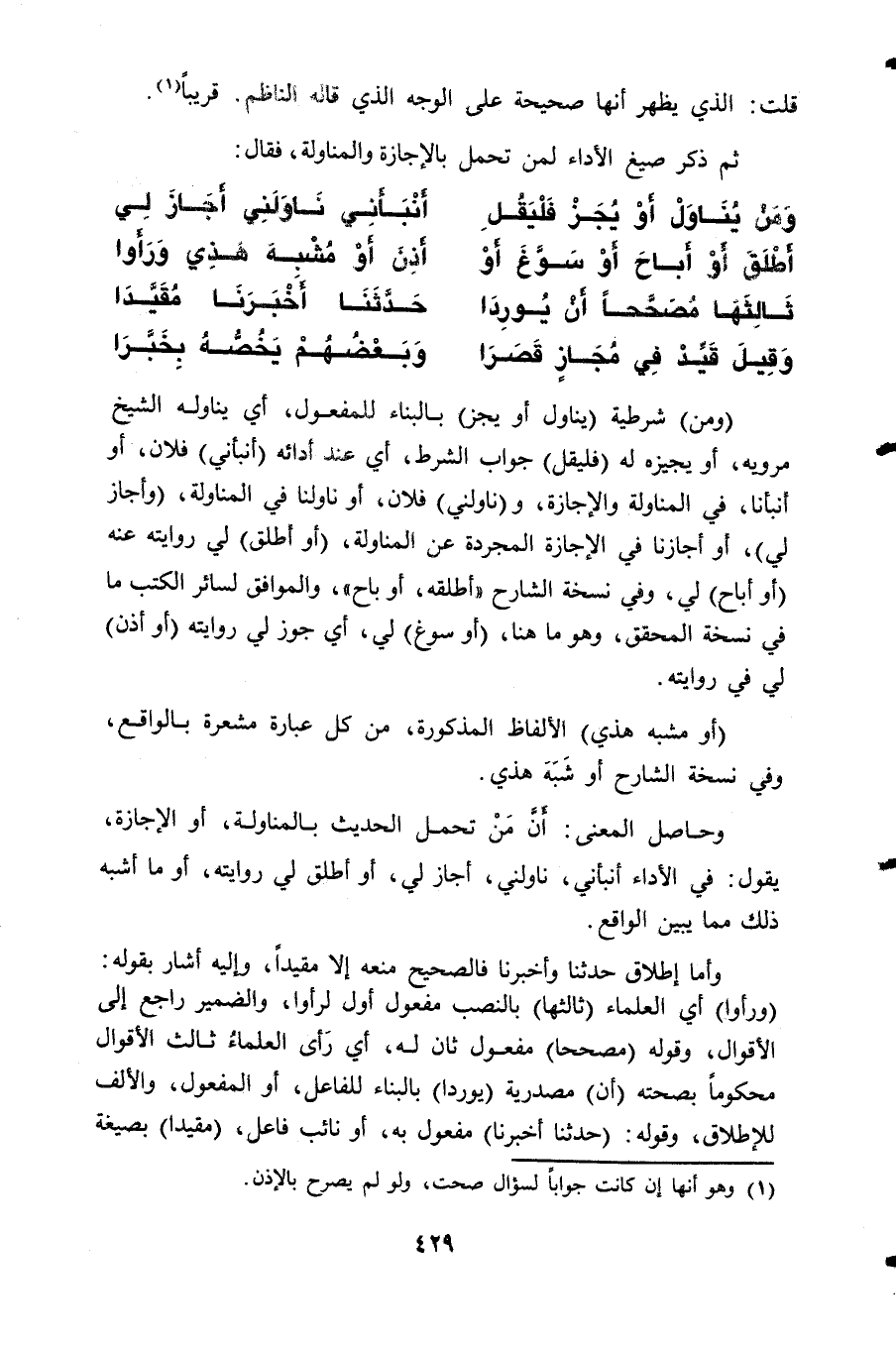وحاصل المعنى: أن مَن تحمل الحديث بالمناولة، أو الإجازة، يقول: في الأداء أنبأني، ناولني، أجاز لي، أو أطلق لي روايته، أو ما أشبه ذلك مما يبين الواقع.