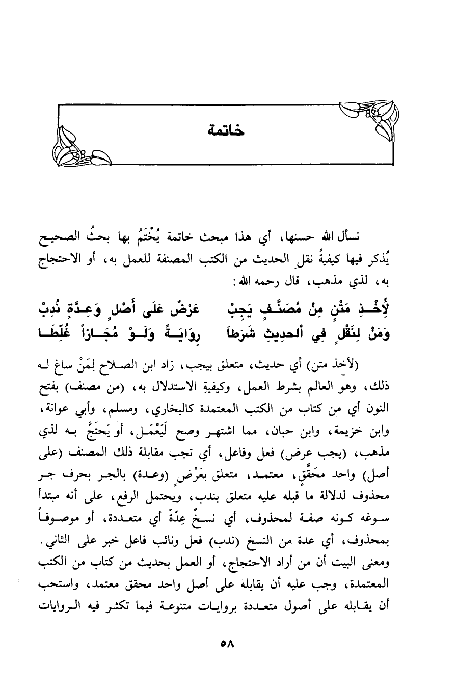 نسأل الله حسنها، أي هذا مبحث خاتمة يُخْتَمُ بها بحثُ الصَّحِيح يُذكر فيها كيفية نقلِ الحديث من الكتب المصنفة للعمل به، أو الاحتجاج به، لذي مذهب، قال رحمه الله: